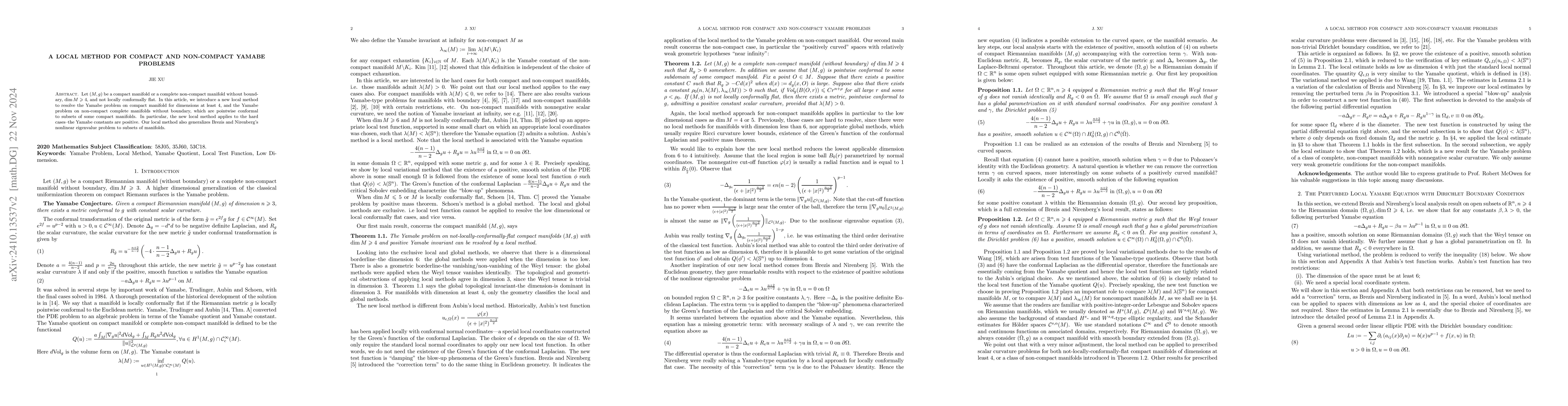 This paper introduces a novel local method to solve the Yamabe problem for both compact and non-compact manifolds in dimensions greater than or equal to 4, focusing on cases where the Yamabe constants are positive. It extends Brezis and Nirenberg's nonlinear eigenvalue problem to non-compact subsets conformal to compact manifolds.
