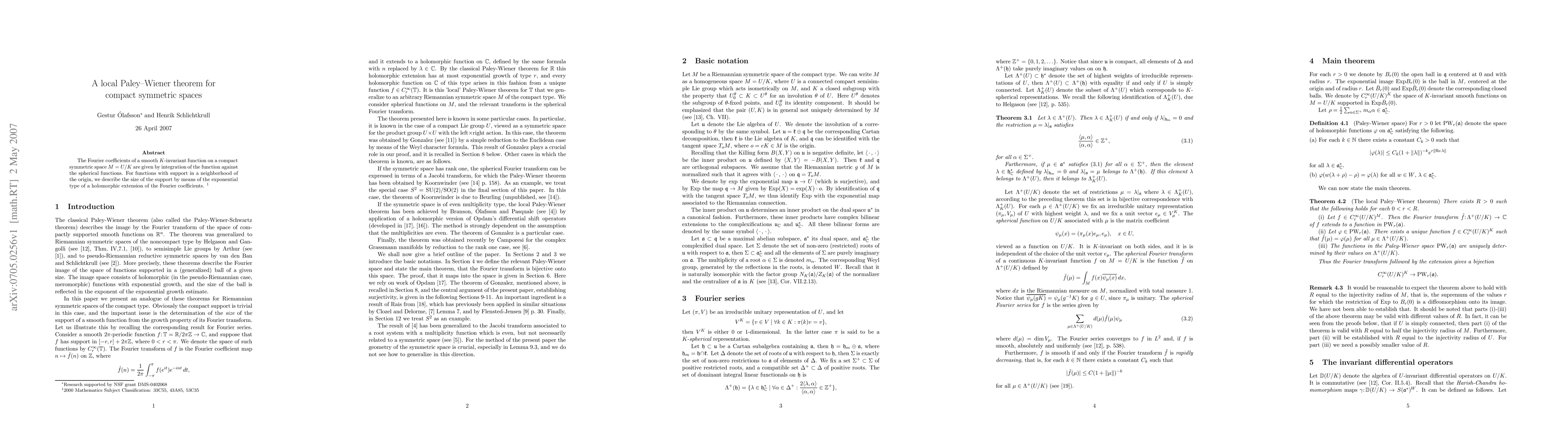 A local Paley-Wiener theorem for compact symmetric spaces describes how to measure the size of a function's support based on its Fourier coefficients, providing insights into smooth $K$-invariant functions on these spaces.