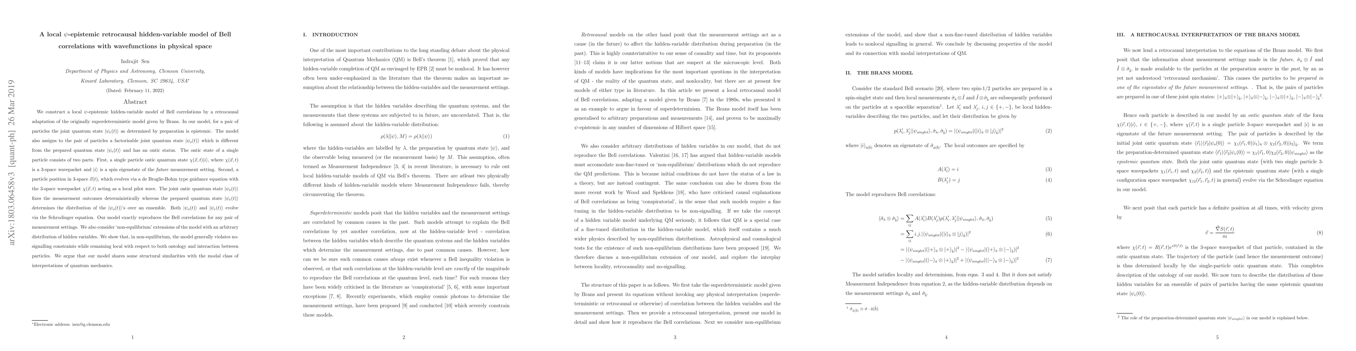 We construct a local $\psi$-epistemic hidden-variable model of Bell correlations by a retrocausal adaptation of the originally superdeterministic model given by Brans. In our model, for a pair of particles the joint quantum state $|\psi_e(t)\rangle$ as determined by preparation is epistemic. The model also assigns to the pair of particles a factorisable joint quantum state $|\psi_o(t)\rangle$ which is different from the prepared quantum state $|\psi_e(t)\rangle$ and has an ontic status. The ontic state of a single particle consists of two parts. First, a single particle ontic quantum state $\chi(\vec{x},t)|i\rangle$, where $\chi(\vec{x},t)$ is a 3-space wavepacket and $|i\rangle$ is a spin eigenstate of the future measurement setting. Second, a particle position in 3-space $\vec{x}(t)$, which evolves via a de Broglie-Bohm type guidance equation with the 3-space wavepacket $\chi(\vec{x},t)$ acting as a local pilot wave. The joint ontic quantum state $|\psi_o(t)\rangle$ fixes the measurement outcomes deterministically whereas the prepared quantum state $|\psi_e(t)\rangle$ determines the distribution of the $|\psi_o(t)\rangle$'s over an ensemble. Both $|\psi_o(t)\rangle$ and $|\psi_e(t)\rangle$ evolve via the Schrodinger equation. Our model exactly reproduces the Bell correlations for any pair of measurement settings. We also consider `non-equilibrium' extensions of the model with an arbitrary distribution of hidden variables. We show that, in non-equilibrium, the model generally violates no-signalling constraints while remaining local with respect to both ontology and interaction between particles. We argue that our model shares some structural similarities with the modal class of interpretations of quantum mechanics.