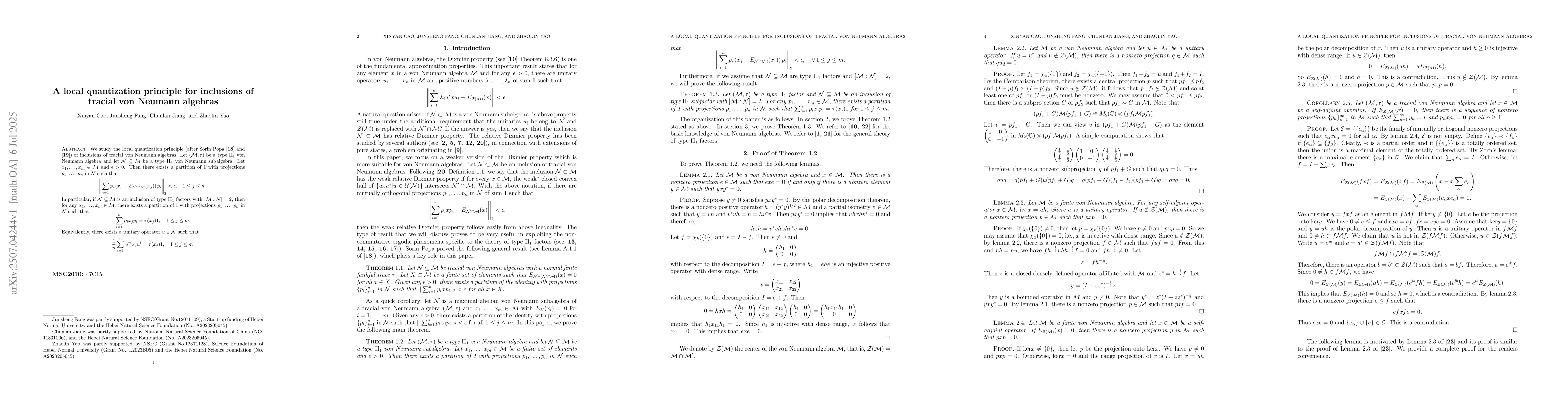 We study the local quantization principle (after Sorin Popa~\cite{popa 94} and \cite{popa 95}) of inclusions of tracial von Neumann algebras. Let $(\mathcal{M},\tau)$ be a type ${\rm II}_1$ von Neumann algebra and let $\mathcal{N}\subseteq \mathcal{M}$ be a type ${\rm II}_1$ von Neumann subalgebra. Let $x_1,\ldots, x_m \in \mathcal{M}$ and $ \epsilon> 0$. Then there exists a partition of 1 with projections $p_{1}, \ldots, p_{n}$ in $\mathcal{N}$ such that \[\left\|\sum_{i=1}^n p_{i}\left(x_j-E_{\mathcal{N}'\cap \mathcal{M}}(x_j)\right)p_{i}\right\|_{2}<\epsilon,\quad 1\leq j\leq m.\] In particular, if $\mathcal{N}\subseteq \mathcal{M}$ is an inclusion of type $\rm II_{1}$ factors with $[\mathcal{M}:\mathcal{N}]=2$, then for any $x_{1},\ldots, x_{m}\in \mathcal{M}$, there exists a partition of 1 with projections $p_{1}, \ldots, p_{n}$ in $\mathcal{N}$ such that \[\sum_{i=1}^n p_ix_jp_i=\tau(x_j)1, \quad 1\leq j\leq m.\] Equivalently, there exists a unitary operator $u\in \mathcal{N}$ such that \[\frac{1}{n}\sum_{i=1}^nu^{*i}x_j u^i=\tau(x_j)1, \quad 1\leq j\leq m.\]
