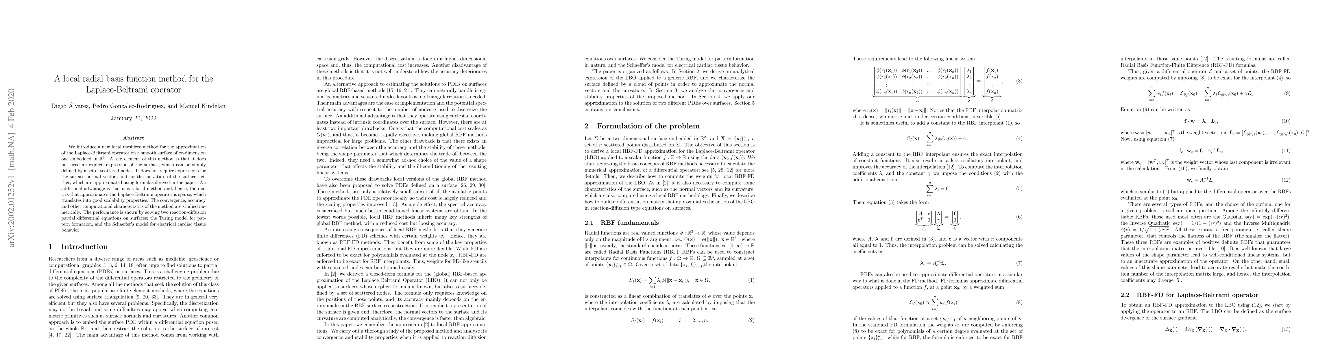 We introduce a new local meshfree method for the approximation of the Laplace-Beltrami operator on a smooth surface of co-dimension one embedded in $\R^3$. A key element of this method is that it does not need an explicit expression of the surface, which can be simply defined by a set of scattered nodes. It does not require expressions for the surface normal vectors and for the curvature of the surface neither, which are approximated using formulas derived in the paper. An additional advantage is that it is a local method and, hence, the matrix that approximates the Laplace-Beltrami operator is sparse, which translates into good scalability properties. The convergence, accuracy and other computational characteristics of the method are studied numerically. The performance is shown by solving two reaction-diffusion partial differential equations on surfaces; the Turing model for pattern formation, and the Schaeffer's model for electrical cardiac tissue behavior.