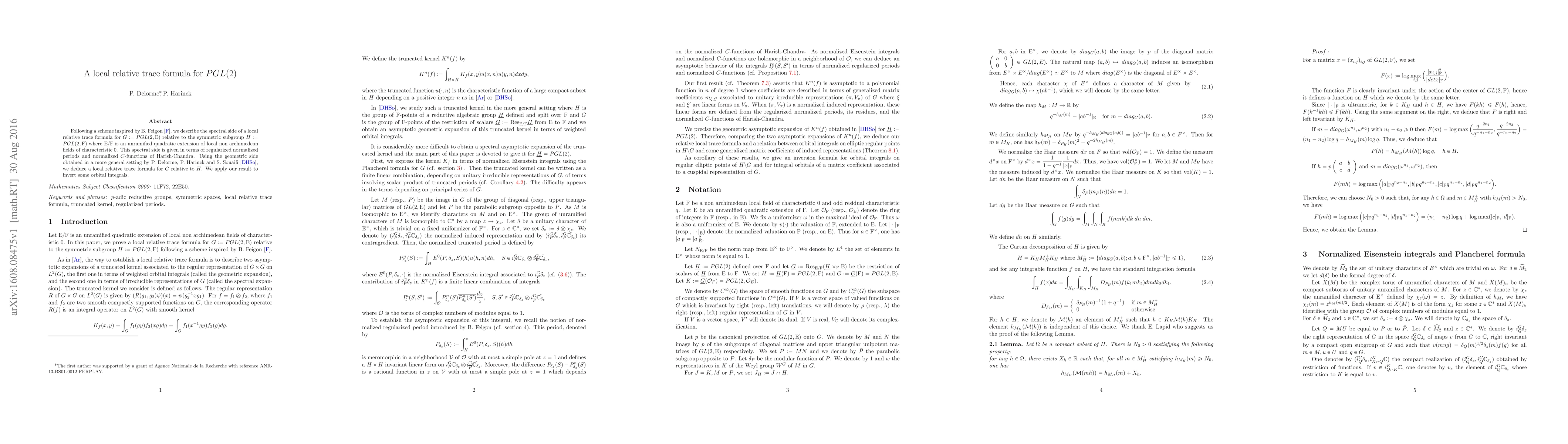 The paper presents a local relative trace formula for $G=PGL(2)$ relative to $H=PGL(2)$, over an unramified quadratic extension of local non-archimedean fields, using normalized periods and $C$-functions. The derived formula helps invert certain orbital integrals.