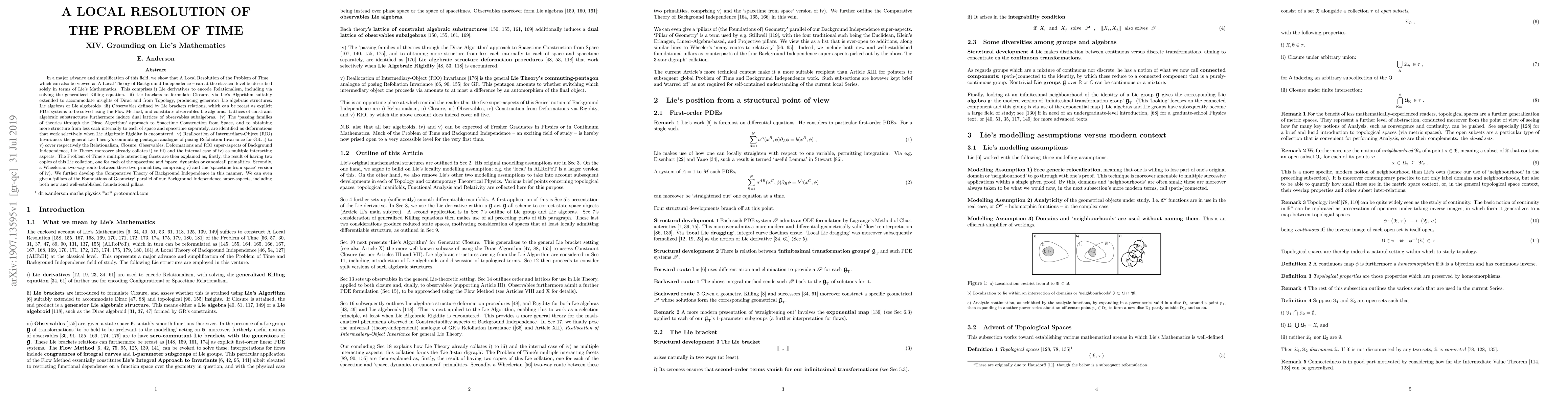 In a major advance and simplification of this field, we show that A Local Resolution of the Problem of Time - also viewable as A Local Theory of Background Independence - can at the classical level be described solely by of Lie's Mathematics. This comprises i) Lie derivatives to encode Relationalism, including via solving the generalized Killing equation. ii) Lie brackets to formulate Closure, via Lie's Algorithm suitably extended to accommodate Dirac and topological insights, producing generator Lie algebraic structures: Lie algebras or algebroids. iii) Observables defined by Lie brackets relations, recastable as explicit PDE systems to be solved using the Flow Method, and constitute observables Lie algebras. iv) The `passing families of theories through the Dirac Algorithm' approach to Spacetime Construction from Space, and to obtaining more structure from less internally to each of space and spacetime separately, are identified as deformations that work selectively when Lie Algebraic Rigidity is encountered. v) Reallocation of Intermediary-Object (RIO) Invariance: the general Lie Theory's commuting-pentagon analogue of posing Refoliation Invariance for GR. i) to v) cover respectively the Relationalism, Closure, Observables, Deformations and RIO super-aspects of Background Independence, Lie Theory moreover already collates i) to iii) and the internal case of iv) as multiple interacting aspects. The Problem of Time's multiple interacting facets are then explained as, firstly, having 2 copies of this Lie collation, 1 for each of spacetime and space primalities. Secondly, a Wheelerian two-way route between these two primalities, comprising v) and iv)'s `spacetime from space' version. We further develop the Comparative Theory of Background Independence thus. We can even give a `pillars of the Foundations of Geometry' parallel of our Background Independence super-aspects.