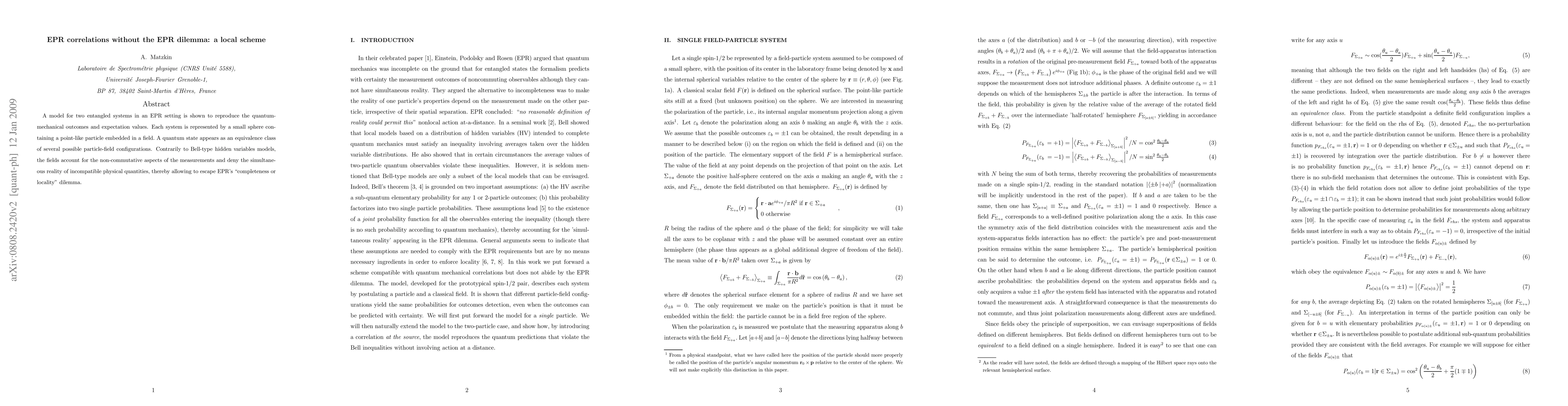 A model for two entangled systems in an EPR setting is shown to reproduce the quantum-mechanical outcomes and expectation values. Each system is represented by a small sphere containing a point-like particle embedded in a field. A quantum state appears as an equivalence class of several possible particle-field configurations. Contrarily to Bell-type hidden variables models, the fields account for the non-commutative aspects of the measurements and deny the simultaneous reality of incompatible physical quantities, thereby allowing to escape EPR's "completeness or locality" dilemma.