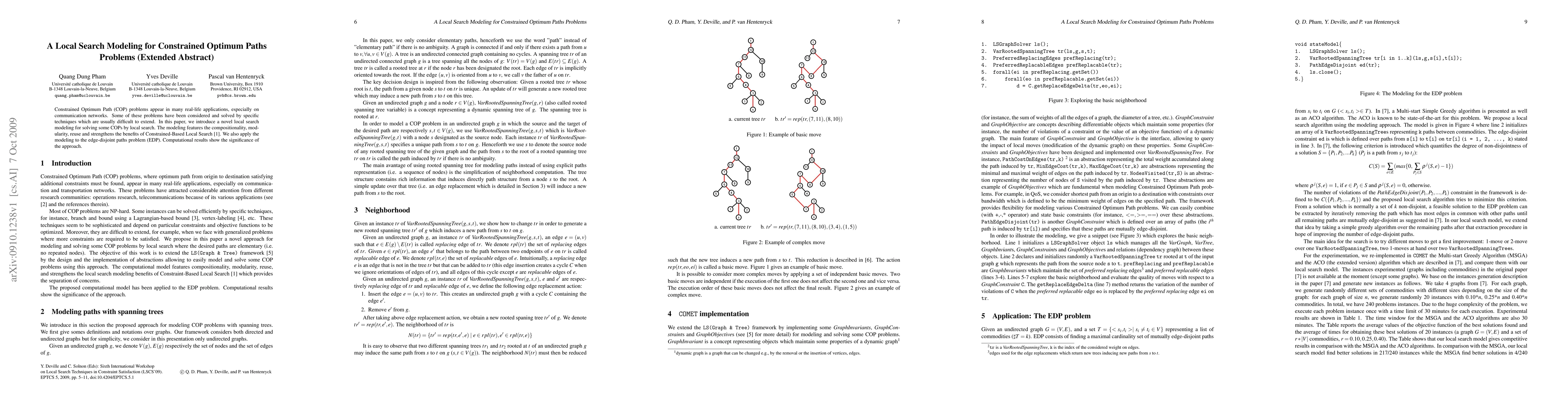 Constrained Optimum Path (COP) problems appear in many real-life applications, especially on communication networks. Some of these problems have been considered and solved by specific techniques which are usually difficult to extend. In this paper, we introduce a novel local search modeling for solving some COPs by local search. The modeling features the compositionality, modularity, reuse and strengthens the benefits of Constrained-Based Local Search. We also apply the modeling to the edge-disjoint paths problem (EDP). We show that side constraints can easily be added in the model. Computational results show the significance of the approach.