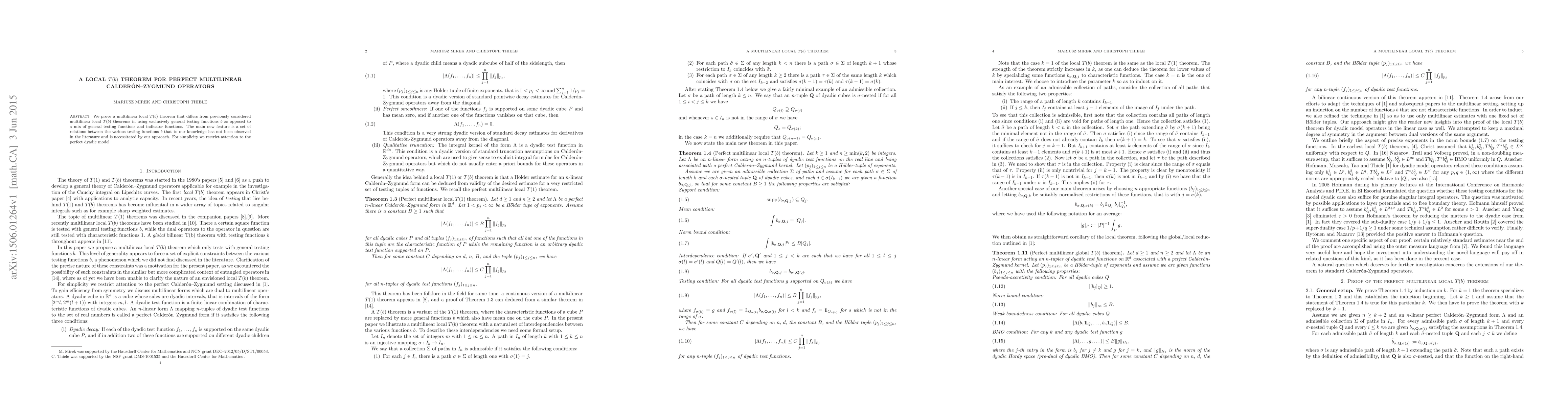 The paper presents a local $T(b)$ theorem for perfect multilinear Calderón-Zygmund operators using exclusively general testing functions, introducing new relations between testing functions not previously observed.