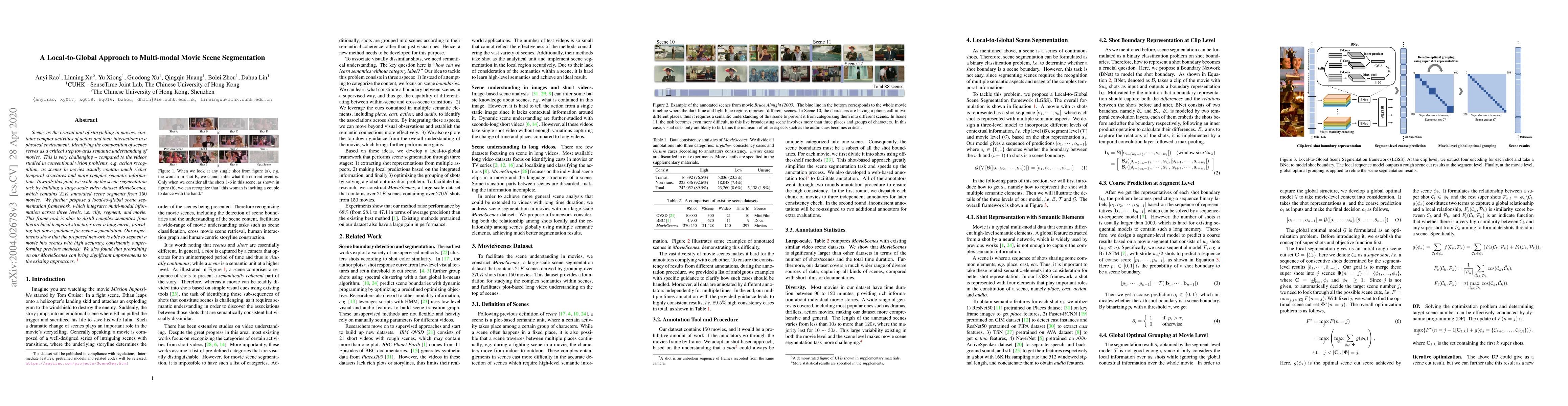 Researchers developed a new approach to segmenting scenes in movies, using a local-to-global framework that leverages multi-modal information across clips, segments, and entire movies. The method achieved high accuracy in scene segmentation and showed improvements when pre-trained on their large-scale MovieScenes dataset.