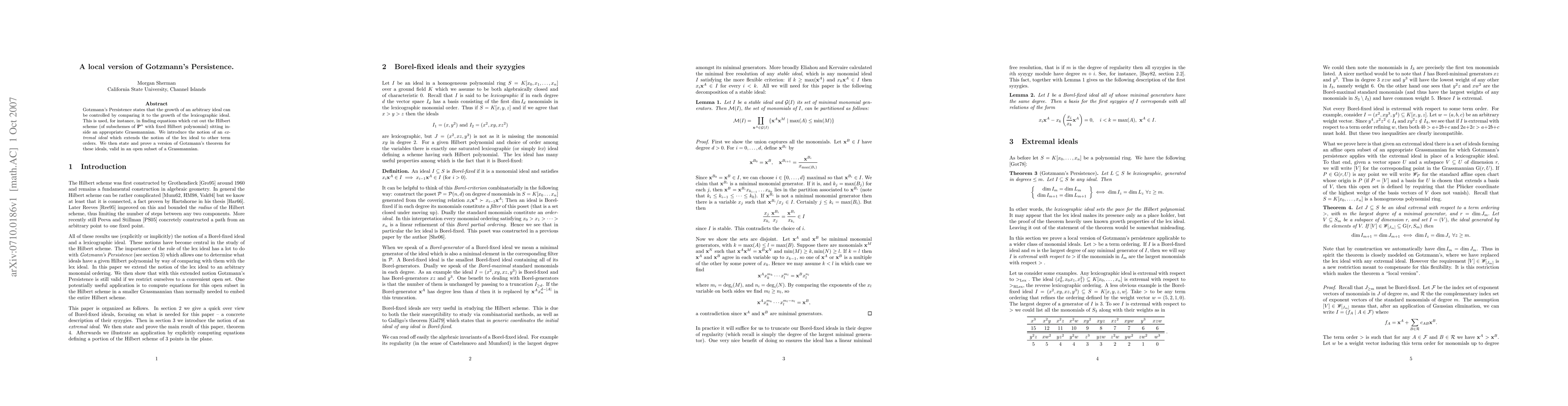 This paper introduces a local version of Gotzmann's Persistence theorem for extremal ideals, extending the concept of lexicographic ideals to other term orders, and proves its validity within an open subset of a Grassmannian. The theorem aids in determining equations for the Hilbert scheme embedded in a Grassmannian.
