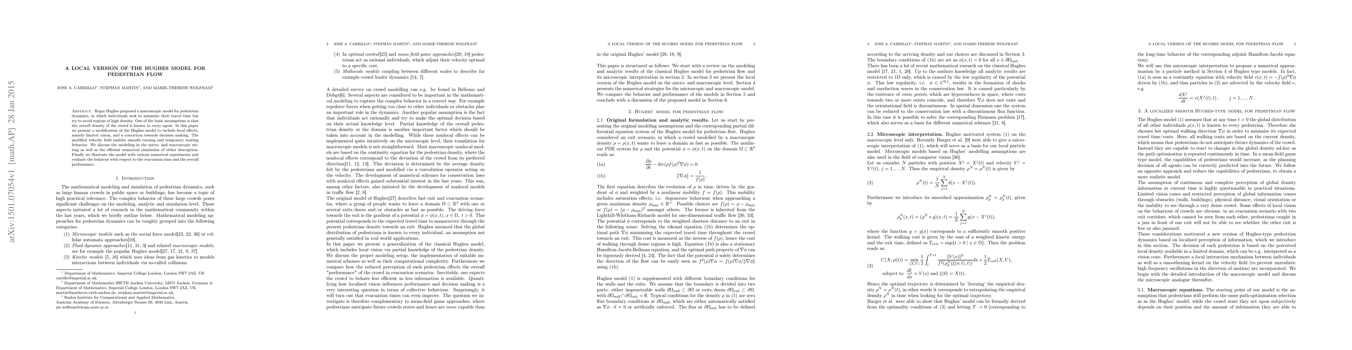 The paper presents a localized, smooth version of Hughes' model for pedestrian dynamics, incorporating local effects, and provides both microscopic and macroscopic numerical simulation techniques.