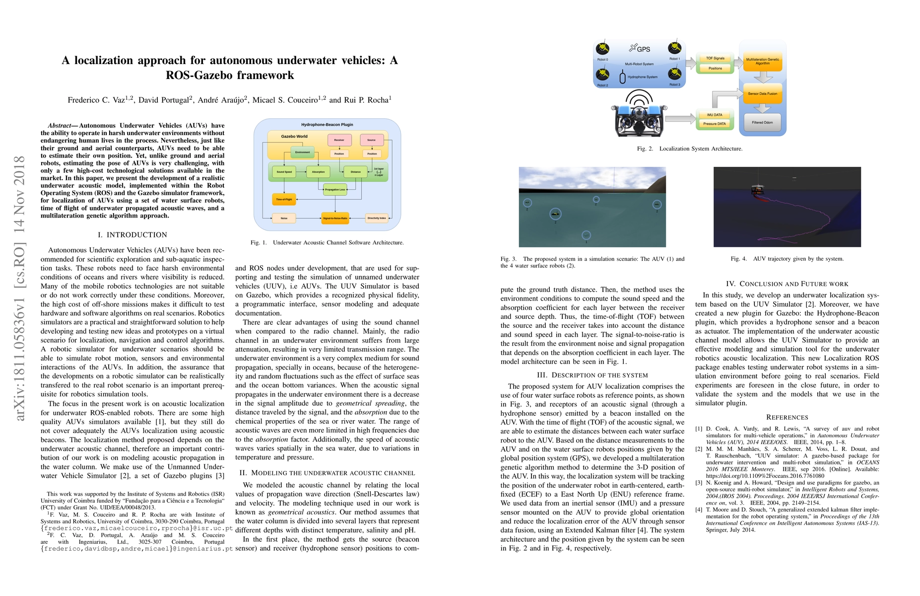 This paper presents a localization framework for Autonomous Underwater Vehicles (AUVs) using a ROS-Gazebo simulation, employing a realistic underwater acoustic model, surface robots, and a multilateration genetic algorithm to estimate AUV pose in challenging underwater environments.