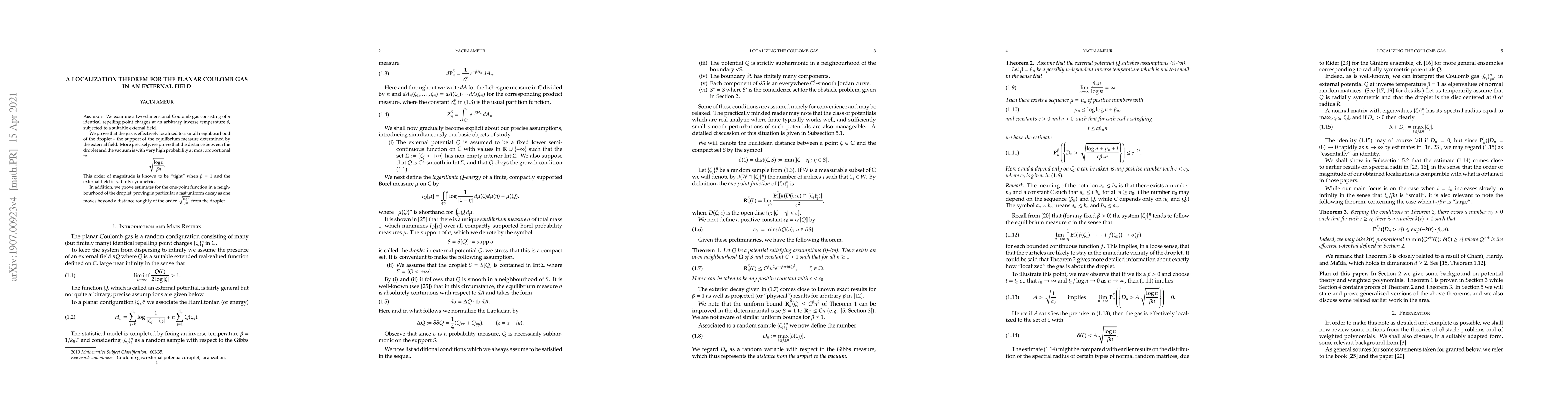 We examine a Coulomb gas consisting of $n$ identical repelling point charges at an arbitrary inverse temperature $\beta$, subjected to a suitable external field. We prove that the gas is effectively localized to a small neighbourhood of the "droplet" -- the support of the equilibrium measure determined by the external field. More precisely, we prove that the distance between the droplet and the vacuum is with very high probability at most proportional to $$\sqrt{\dfrac {\log n}{\beta n}}.$$ This order of magnitude is known to be "tight" when $\beta=1$ and the external field is radially symmetric. In addition, we prove estimates for the one-point function in a neighbourhood of the droplet, proving in particular a fast uniform decay as one moves beyond a distance roughly of the order $\sqrt{\frac {\log n}{\beta n}}$ from the droplet.