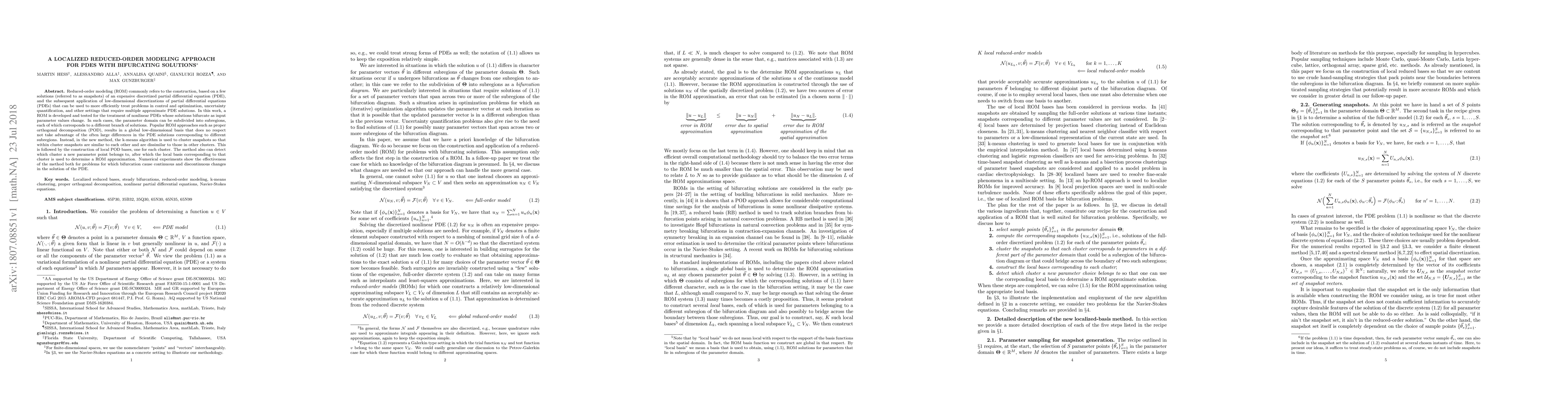 This paper proposes a localized reduced-order modeling (ROM) approach for nonlinear PDEs that bifurcate with changing parameters. It uses k-means clustering to create local proper orthogonal decomposition (POD) bases for different solution branches, improving efficiency and accuracy over global POD methods. Numerical experiments demonstrate the method's effectiveness for both continuous and discontinuous bifurcation scenarios.