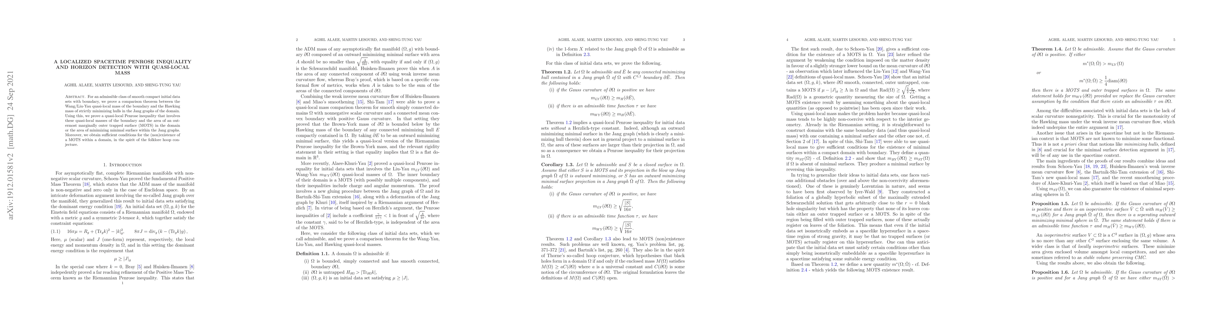 For an admissible class of smooth compact initial data sets with boundary, we prove a comparison theorem between the Wang/Liu-Yau quasi-local mass of the boundary and the Hawking mass of strictly minimizing hulls in the Jang graphs of the domain. Using this, we prove a quasi-local Penrose inequality that involves these quasi-local masses of the boundary and the area of an outermost marginally outer trapped surface (MOTS) in the domain or the area of minimizing minimal surface within the Jang graphs. Moreover, we obtain sufficient conditions for the (non)existence of a MOTS within a domain, in the spirit of the folklore hoop conjecture.