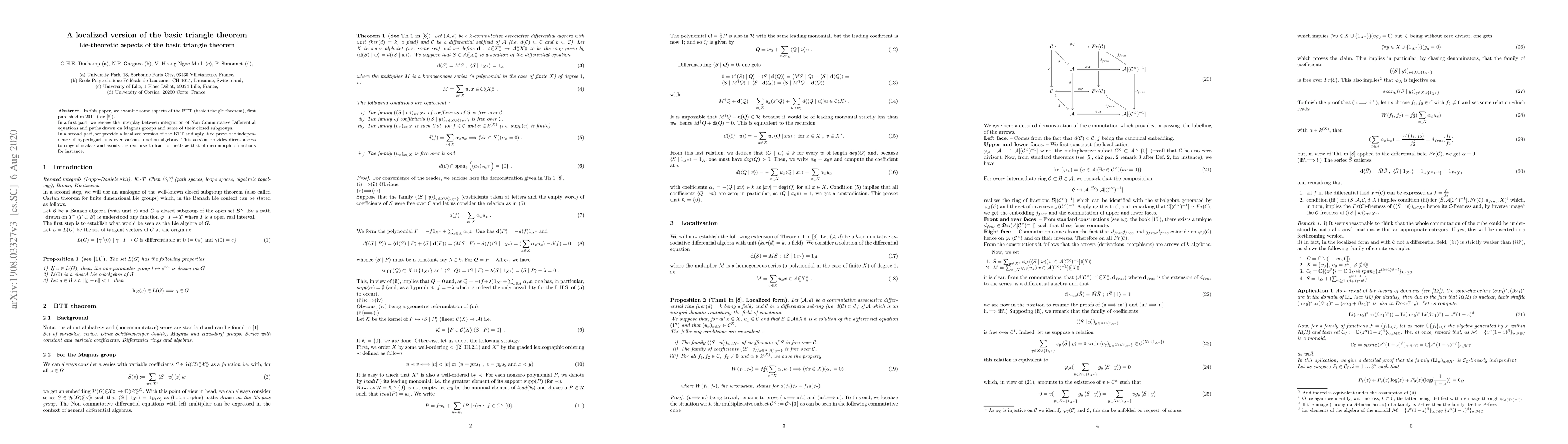 In this short note, we give a localized version of the basic triangle theorem, first published in 2011 (see [4]) in order to prove the independence of hyperlogarithms over various function fields. This version provides direct access to rings of scalars and avoids the recourse to fraction fields as that of meromorphic functions for instance.