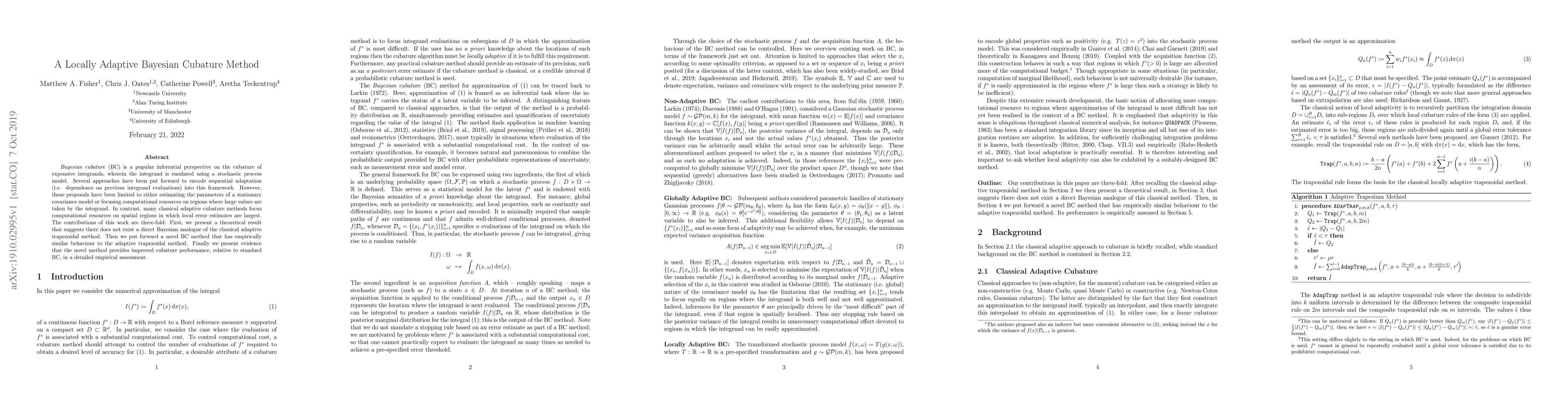 This paper introduces a novel locally adaptive Bayesian cubature method that mimics the adaptive trapezoidal method's focus on regions with high local error. The authors demonstrate that the new method outperforms standard Bayesian cubature in empirical assessments.