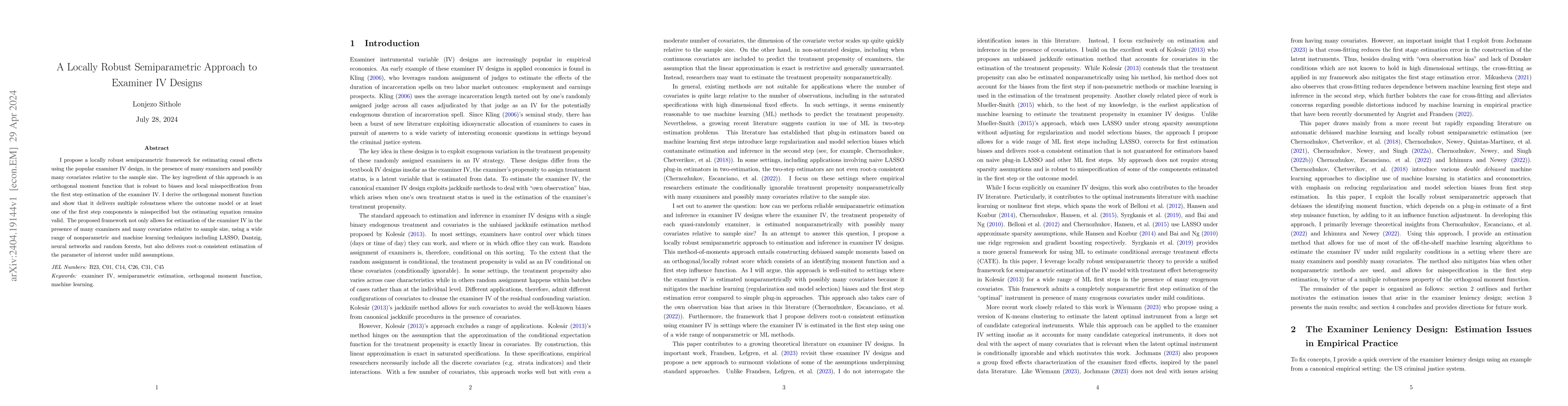 This paper introduces a robust semiparametric method for estimating causal effects in examiner instrumental variable (IV) designs, accommodating numerous examiners and covariates. It utilizes an orthogonal moment function to ensure robustness against model misspecification, enabling consistent estimation under mild conditions.