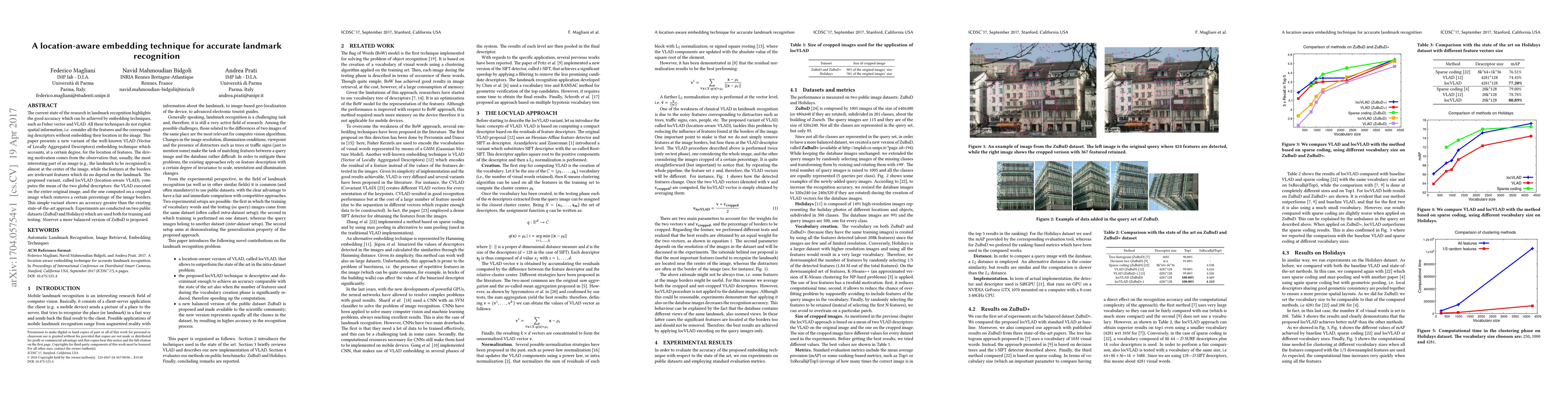 This paper introduces locVLAD, a new location-aware variant of the VLAD embedding technique for landmark recognition, which considers feature locations to improve accuracy. Experiments on ZuBuD and Holidays datasets show that locVLAD outperforms existing methods by focusing on central features.