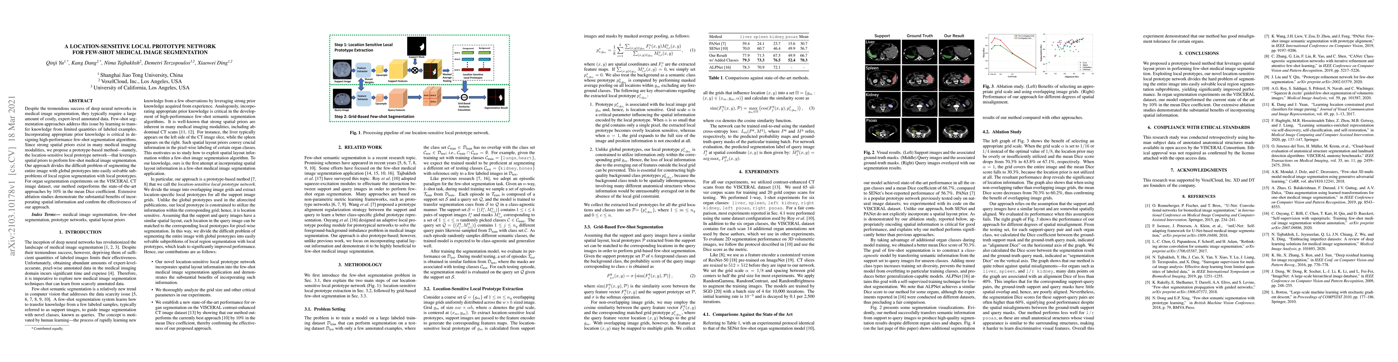 This paper proposes a location-sensitive local prototype network for few-shot segmentation of medical images, leveraging spatial priors to divide global segmentation into manageable local tasks. The method outperforms state-of-the-art approaches on the VISCERAL CT image dataset, demonstrating a 10% improvement in mean Dice coefficient.