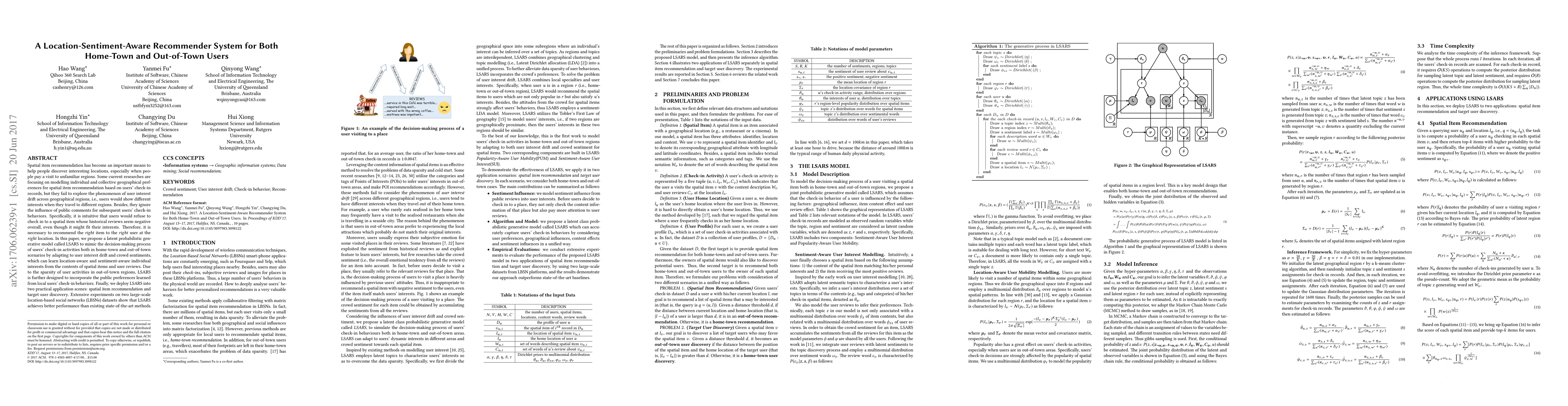 This paper proposes LSARS, a location-sentiment-aware recommender system that adapts to user interest drift and crowd sentiments for both home-town and out-of-town users. It outperforms existing methods by incorporating public preferences and achieving better performance in spatial item recommendation and target user discovery.