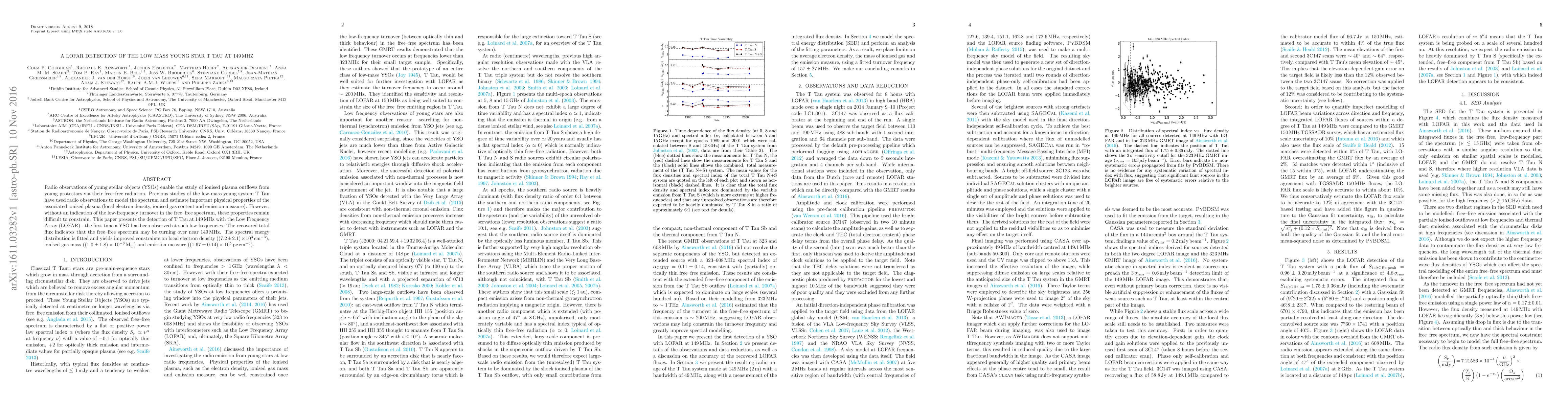 Radio observations of young stellar objects (YSOs) enable the study of ionised plasma outflows from young protostars via their free-free radiation. Previous studies of the low-mass young system T Tau have used radio observations to model the spectrum and estimate important physical properties of the associated ionised plasma (local electron density, ionised gas content and emission measure). However, without an indication of the low-frequency turnover in the free-free spectrum, these properties remain difficult to constrain. This paper presents the detection of T Tau at 149 MHz with the Low Frequency Array (LOFAR) - the first time a YSO has been observed at such low frequencies. The recovered total flux indicates that the free-free spectrum may be turning over near 149 MHz. The spectral energy distribution is fitted and yields improved constraints on local electron density ($(7.2 \pm 2.1)\times10^{3}$ cm$^{-3}$), ionised gas mass ($(1.0 \pm 1.8)\times10^{-6}$ M$_{\odot}$) and emission measure ($(1.67 \pm 0.14)\times10^5$ pc cm$^{-6}$).