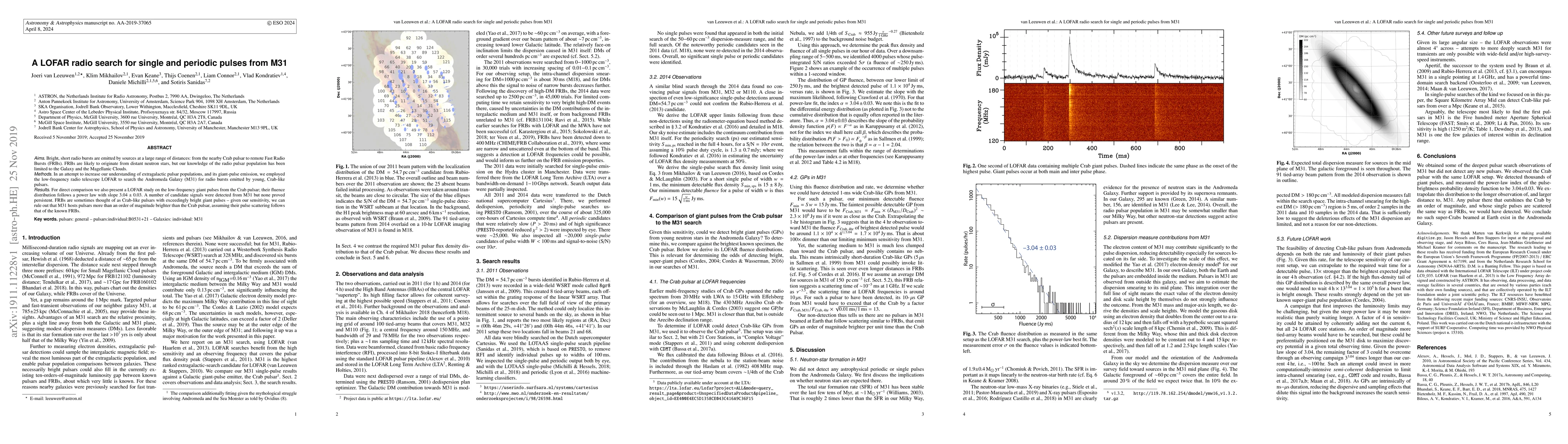 Bright, short radio bursts are emitted by sources at a large range of distances: from the nearby Crab pulsar to remote Fast Radio Bursts (FRBs). FRBs are likely to originate from distant neutron stars, but our knowledge of the radio pulsar population has been limited to the Galaxy and the Magellanic Clouds. In an attempt to increase our understanding of extragalactic pulsar populations, and its giant-pulse emission, we employed the low-frequency radio telescope LOFAR to search the Andromeda Galaxy (M31) for radio bursts emitted by young, Crab-like pulsars. For direct comparison we also present a LOFAR study on the low-frequency giant pulses from the Crab pulsar; their fluence distribution follows a power law with slope 3.04(3). A number of candidate signals were detected from M31 but none proved persistent. FRBs are sometimes thought of as Crab-like pulsars with exceedingly bright giant pulses -- given our sensitivity, we can rule out that M31 hosts pulsars more than an order of magnitude brighter than the Crab pulsar, assuming their pulse scattering follows that of the known FRBs.