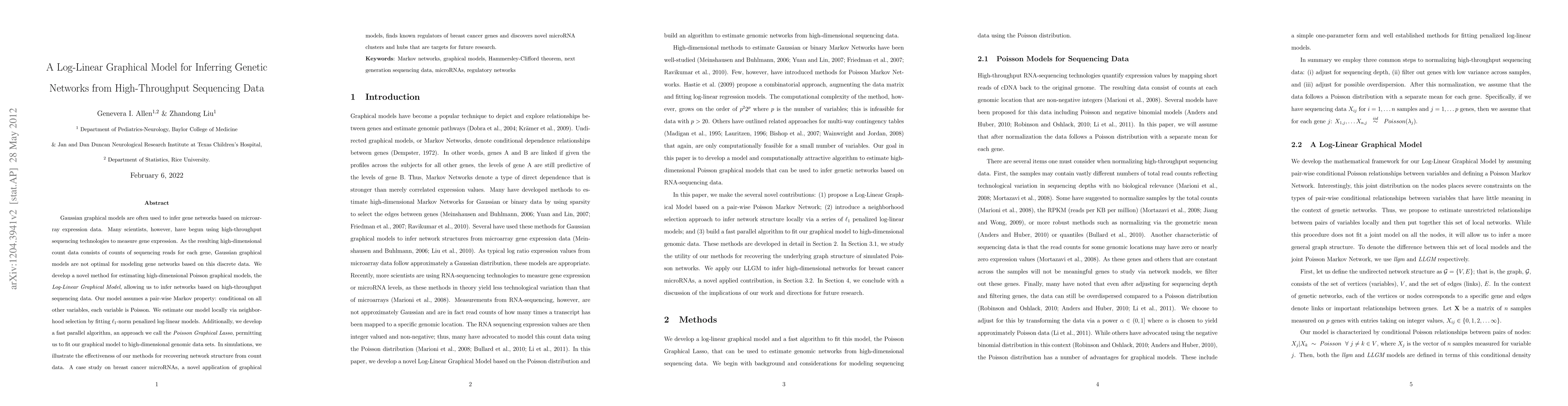 This paper introduces a Log-Linear Graphical Model for inferring genetic networks from high-throughput sequencing data, addressing the limitations of Gaussian graphical models for discrete count data. The proposed method, along with a fast parallel algorithm called the Poisson Graphical Lasso, effectively recovers network structures and identifies known and novel microRNA regulators in breast cancer.