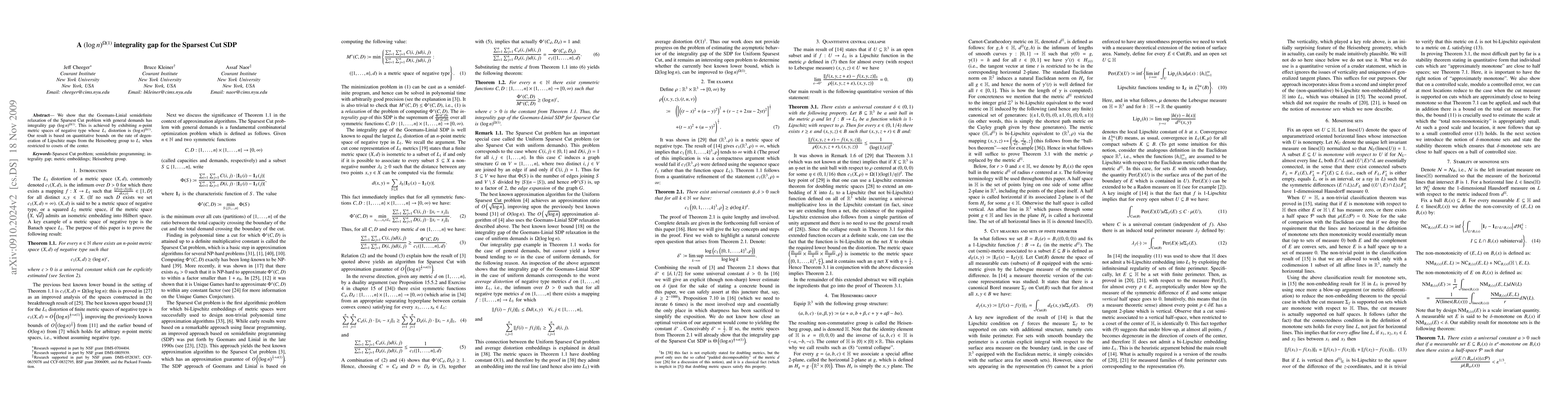 We show that the Goemans-Linial semidefinite relaxation of the Sparsest Cut problem with general demands has integrality gap $(\log n)^{\Omega(1)}$. This is achieved by exhibiting $n$-point metric spaces of negative type whose $L_1$ distortion is $(\log n)^{\Omega(1)}$. Our result is based on quantitative bounds on the rate of degeneration of Lipschitz maps from the Heisenberg group to $L_1$ when restricted to cosets of the center.