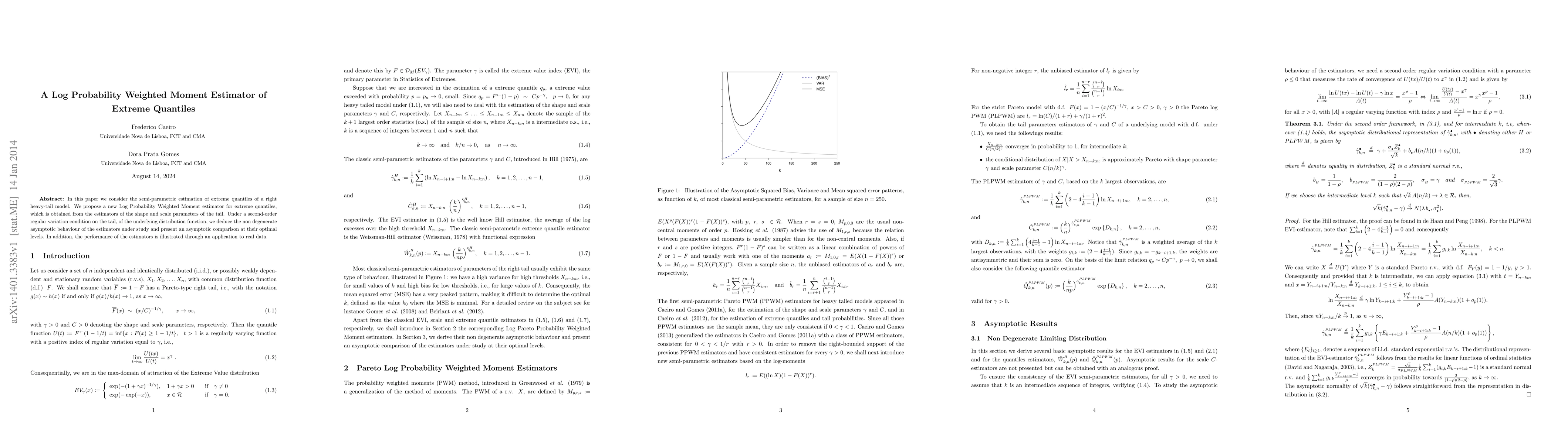 In this paper we consider the semi-parametric estimation of extreme quantiles of a right heavy-tail model. We propose a new Log Probability Weighted Moment estimator for extreme quantiles, which is obtained from the estimators of the shape and scale parameters of the tail. Under a second-order regular variation condition on the tail, of the underlying distribution function, we deduce the non degenerate asymptotic behaviour of the estimators under study and present an asymptotic comparison at their optimal levels. In addition, the performance of the estimators is illustrated through an application to real data.