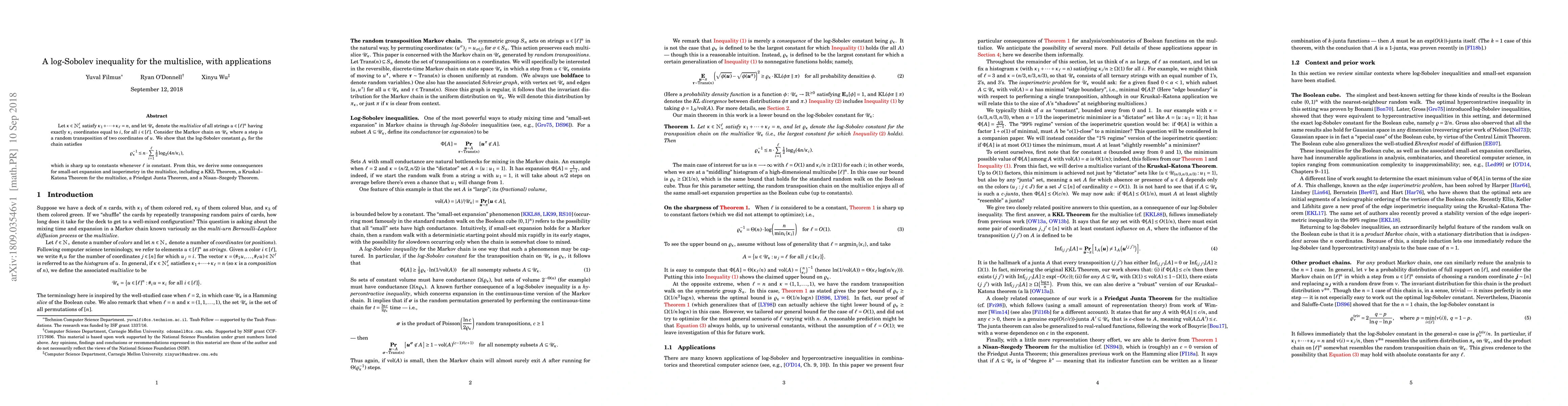 A log-Sobolev inequality is established for the multislice of strings with exactly ε_i coordinates equal to i, providing bounds on a Markov chain's mixing time with applications in small-set expansion and isoperimetry.