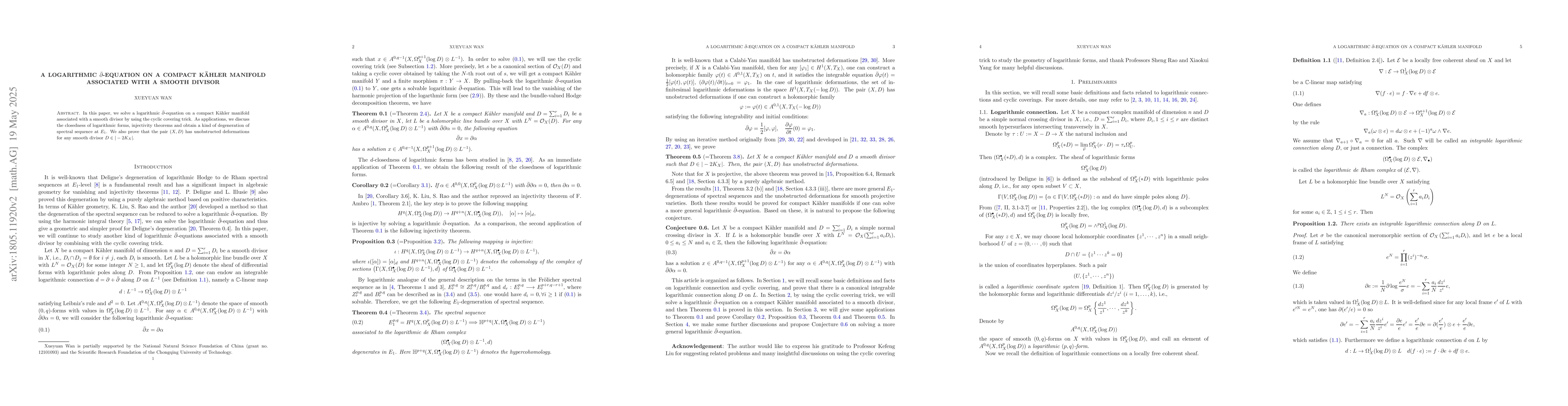 This paper solves a logarithmic $\bar{\partial}$-equation on a compact Kähler manifold linked to a smooth divisor using the cyclic covering trick. It also explores applications including the closedness of logarithmic forms, injectivity theorems, and proves unobstructed deformations for pairs $(X,D)$ with $D\in|-2K_X|$.