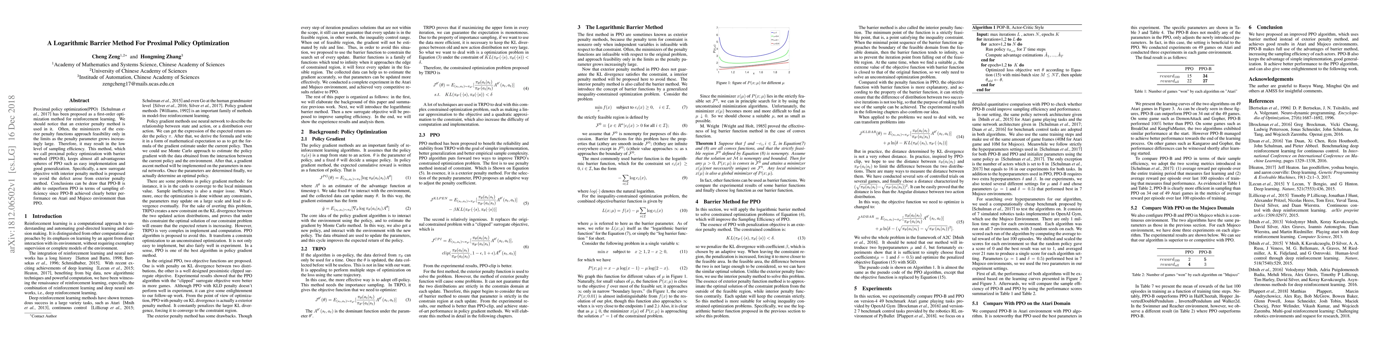 Proximal policy optimization(PPO) has been proposed as a first-order optimization method for reinforcement learning. We should notice that an exterior penalty method is used in it. Often, the minimizers of the exterior penalty functions approach feasibility only in the limits as the penalty parameter grows increasingly large. Therefore, it may result in the low level of sampling efficiency. This method, which we call proximal policy optimization with barrier method (PPO-B), keeps almost all advantageous spheres of PPO such as easy implementation and good generalization. Specifically, a new surrogate objective with interior penalty method is proposed to avoid the defect arose from exterior penalty method. Conclusions can be draw that PPO-B is able to outperform PPO in terms of sampling efficiency since PPO-B achieved clearly better performance on Atari and Mujoco environment than PPO.