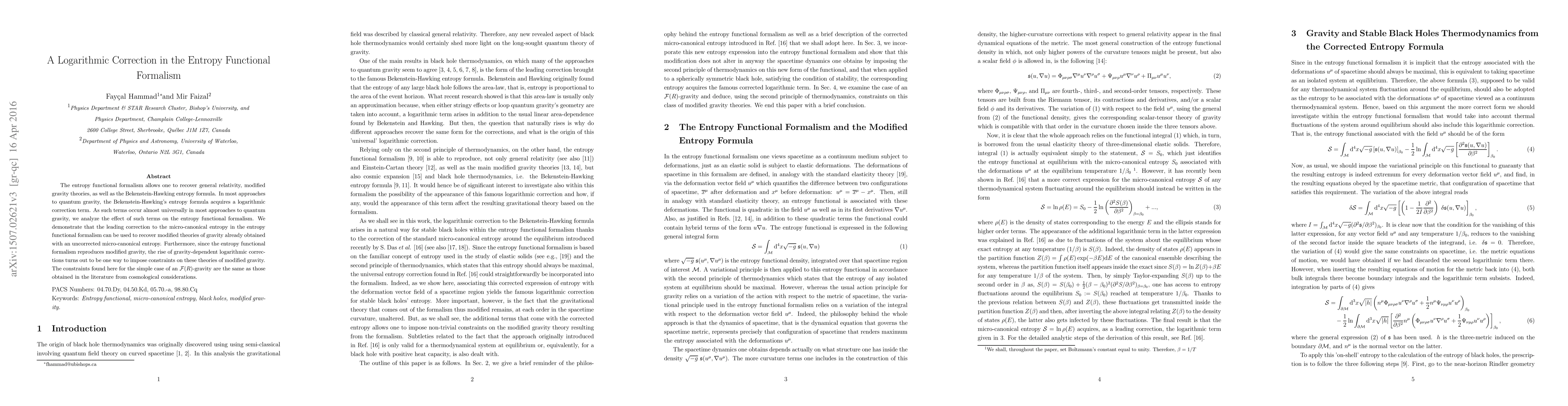 The entropy functional formalism allows one to recover general relativity, modified gravity theories, as well as the Bekenstein-Hawking entropy formula. In most approaches to quantum gravity, the Bekenstein-Hawking's entropy formula acquires a logarithmic correction term. As such terms occur almost universally in most approaches to quantum gravity, we analyze the effect of such terms on the entropy functional formalism. We demonstrate that the leading correction to the micro-canonical entropy in the entropy functional formalism can be used to recover modified theories of gravity already obtained with an uncorrected micro-canonical entropy. Furthermore, since the entropy functional formalism reproduces modified gravity, the rise of gravity-dependent logarithmic corrections turns out to be one way to impose constraints on these theories of modified gravity. The constraints found here for the simple case of an F(R)-gravity are the same as those obtained in the literature from cosmological considerations.