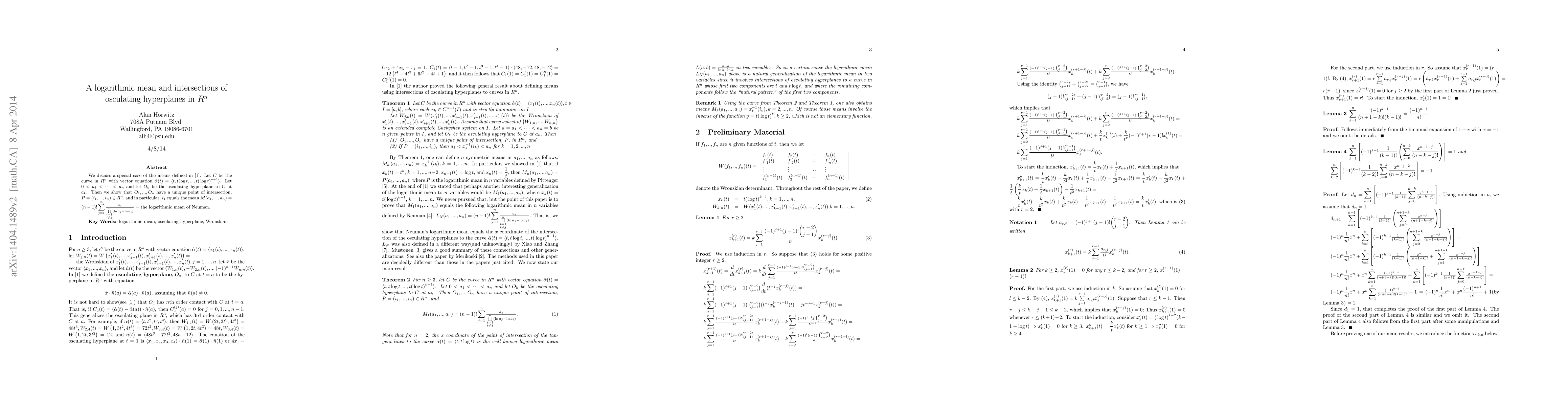 This paper explores a family of logarithmic means defined via intersections of osculating hyperplanes to a specific curve in R^n. It demonstrates that these hyperplanes intersect uniquely at a point P, where the first coordinate corresponds to the logarithmic mean in n variables of Neuman.