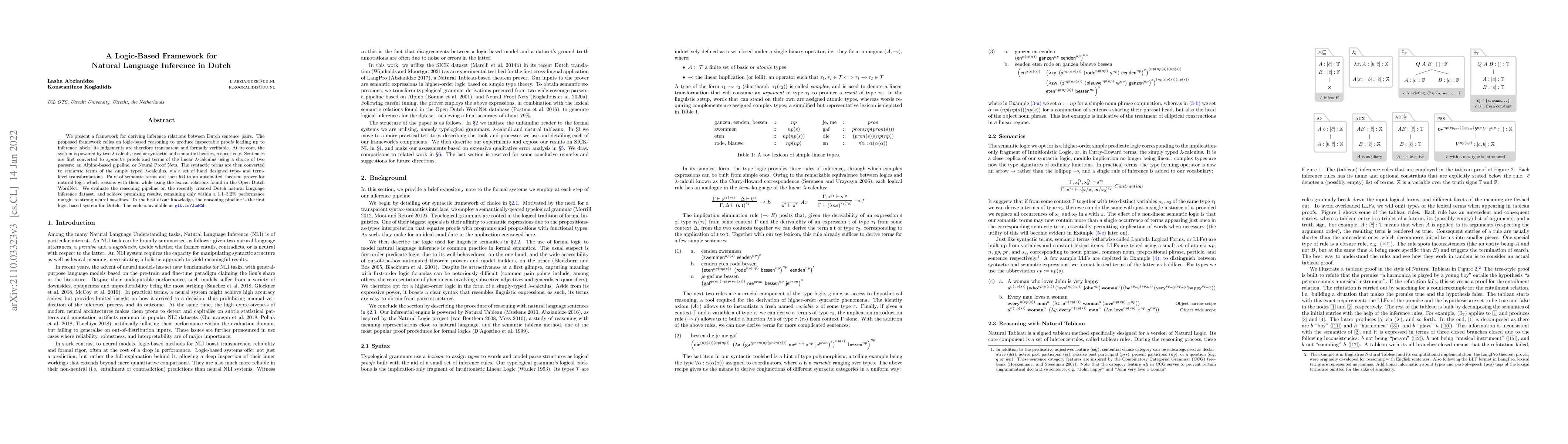 We present a framework for deriving inference relations between Dutch sentence pairs. The proposed framework relies on logic-based reasoning to produce inspectable proofs leading up to inference labels; its judgements are therefore transparent and formally verifiable. At its core, the system is powered by two ${\lambda}$-calculi, used as syntactic and semantic theories, respectively. Sentences are first converted to syntactic proofs and terms of the linear ${\lambda}$-calculus using a choice of two parsers: an Alpino-based pipeline, and Neural Proof Nets. The syntactic terms are then converted to semantic terms of the simply typed ${\lambda}$-calculus, via a set of hand designed type- and term-level transformations. Pairs of semantic terms are then fed to an automated theorem prover for natural logic which reasons with them while using the lexical relations found in the Open Dutch WordNet. We evaluate the reasoning pipeline on the recently created Dutch natural language inference dataset, and achieve promising results, remaining only within a $1.1-3.2{\%}$ performance margin to strong neural baselines. To the best of our knowledge, the reasoning pipeline is the first logic-based system for Dutch.