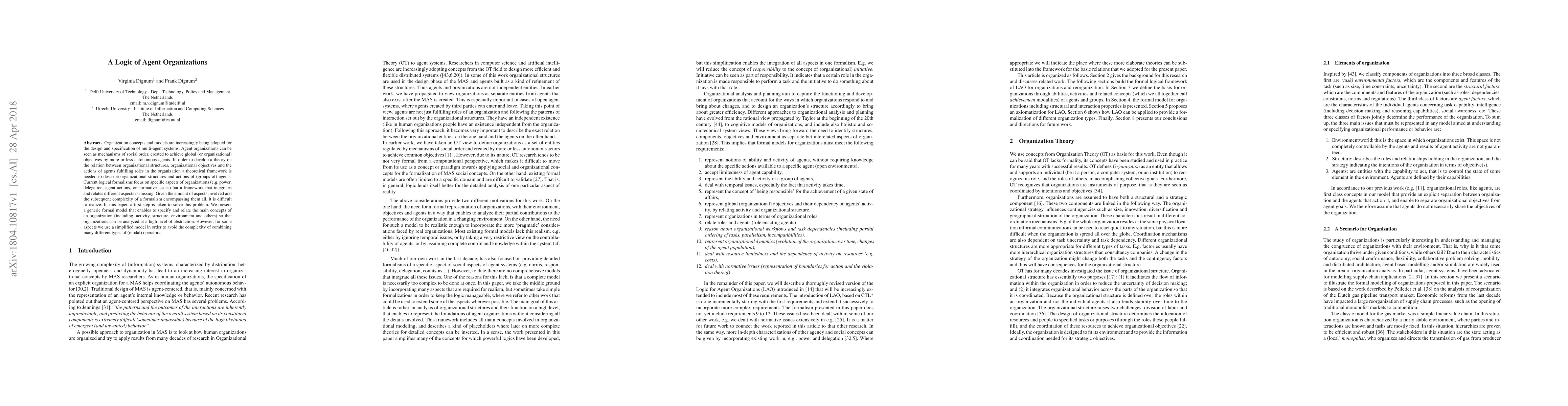 This paper introduces a formal model to integrate and relate various aspects of agent organizations, including structure, activity, and environment, aiming to analyze organizations at a high level of abstraction. While some aspects are simplified to manage complexity, the framework provides a foundational step towards a comprehensive theory of organizational structures and agent actions.