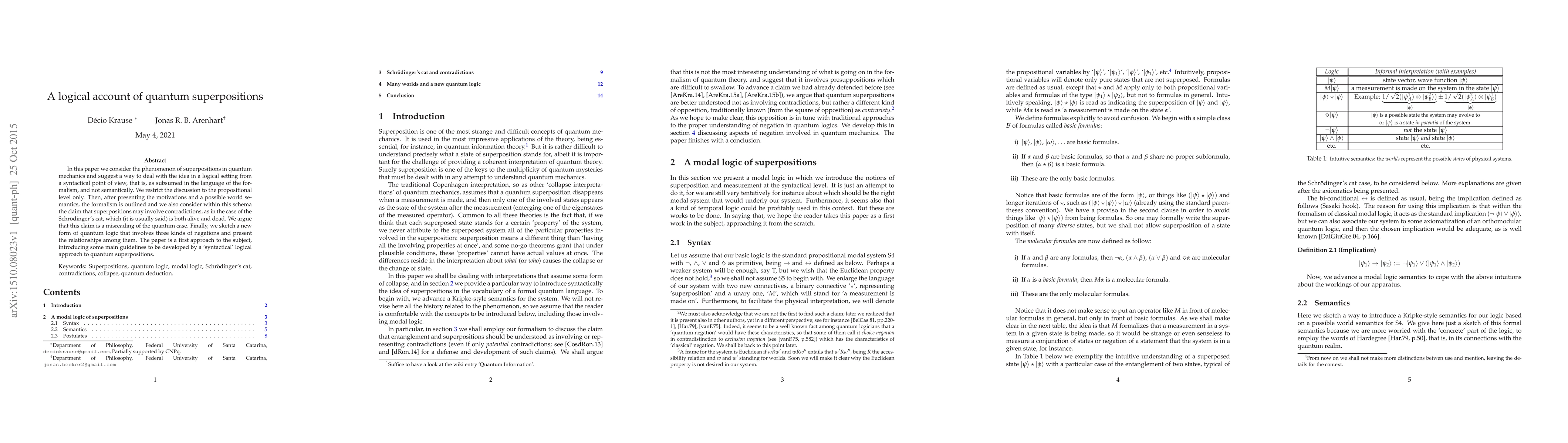 This paper proposes a logical account of quantum superpositions by introducing a new form of quantum logic that involves three kinds of negations, aiming to resolve contradictions in the phenomenon, and provides a syntactical approach to understanding superpositions.