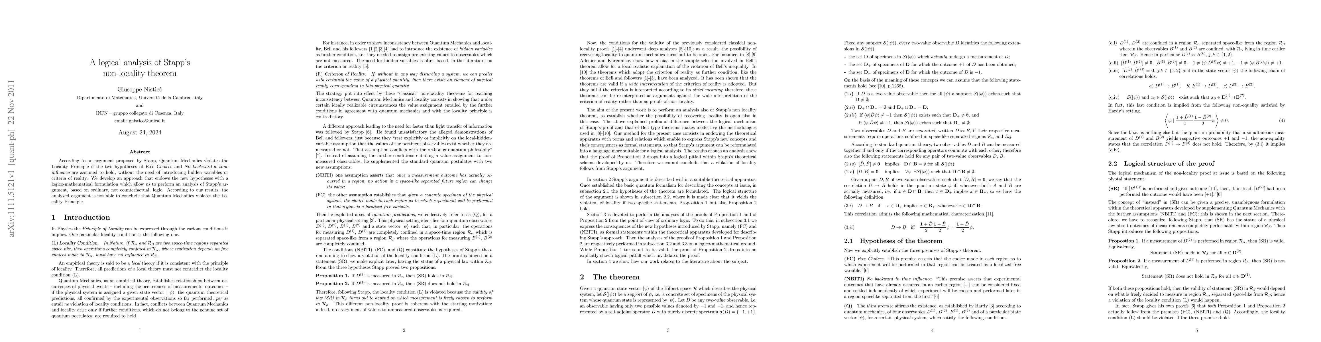 According to an argument proposed by Stapp, Quantum Mechanics violates the Locality Principle if the two hypotheses of {\sl Free Choices} and {\sl No backward-in-time influence} are assumed to hold, without the need of introducing hidden variables or criteria of reality. We develop an approach that endows the new hypotheses with a logico-mathematical formulation which allow us to perform an analysis of Stapp's argument, based on ordinary, not counterfactual, logic. According to our results, the analyzed argument is not able to conclude that Quantum Mechanics violates the Locality Principle.