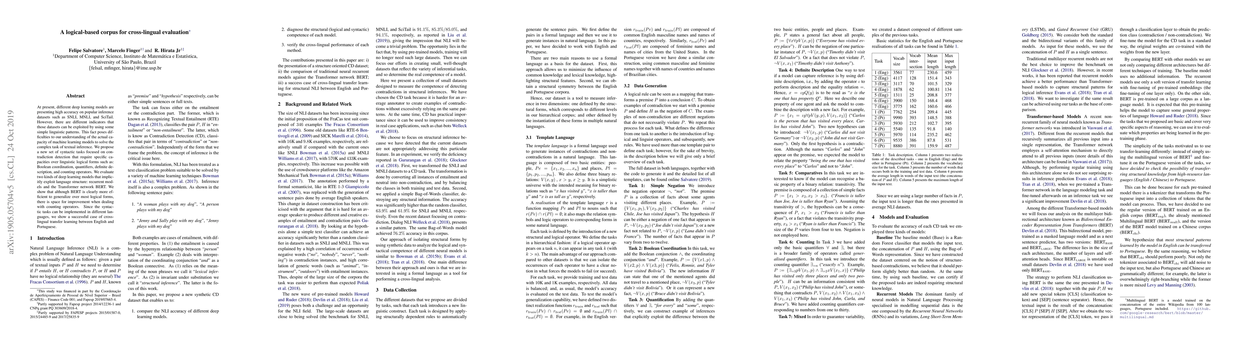 At present, different deep learning models are presenting high accuracy on popular inference datasets such as SNLI, MNLI, and SciTail. However, there are different indicators that those datasets can be exploited by using some simple linguistic patterns. This fact poses difficulties to our understanding of the actual capacity of machine learning models to solve the complex task of textual inference. We propose a new set of syntactic tasks focused on contradiction detection that require specific capacities over linguistic logical forms such as: Boolean coordination, quantifiers, definite description, and counting operators. We evaluate two kinds of deep learning models that implicitly exploit language structure: recurrent models and the Transformer network BERT. We show that although BERT is clearly more efficient to generalize over most logical forms, there is space for improvement when dealing with counting operators. Since the syntactic tasks can be implemented in different languages, we show a successful case of cross-lingual transfer learning between English and Portuguese.