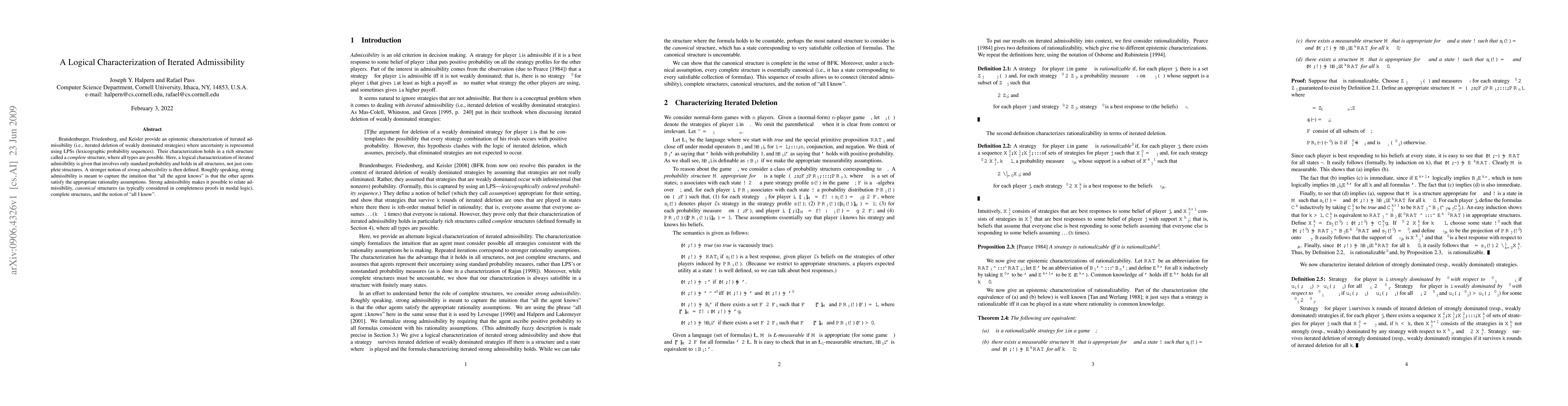 Brandenburger, Friedenberg, and Keisler provide an epistemic characterization of iterated admissibility (i.e., iterated deletion of weakly dominated strategies) where uncertainty is represented using LPSs (lexicographic probability sequences). Their characterization holds in a rich structure called a complete structure, where all types are possible. Here, a logical charaacterization of iterated admisibility is given that involves only standard probability and holds in all structures, not just complete structures. A stronger notion of strong admissibility is then defined. Roughly speaking, strong admissibility is meant to capture the intuition that "all the agent knows" is that the other agents satisfy the appropriate rationality assumptions. Strong admissibility makes it possible to relate admissibility, canonical structures (as typically considered in completeness proofs in modal logic), complete structures, and the notion of ``all I know''.