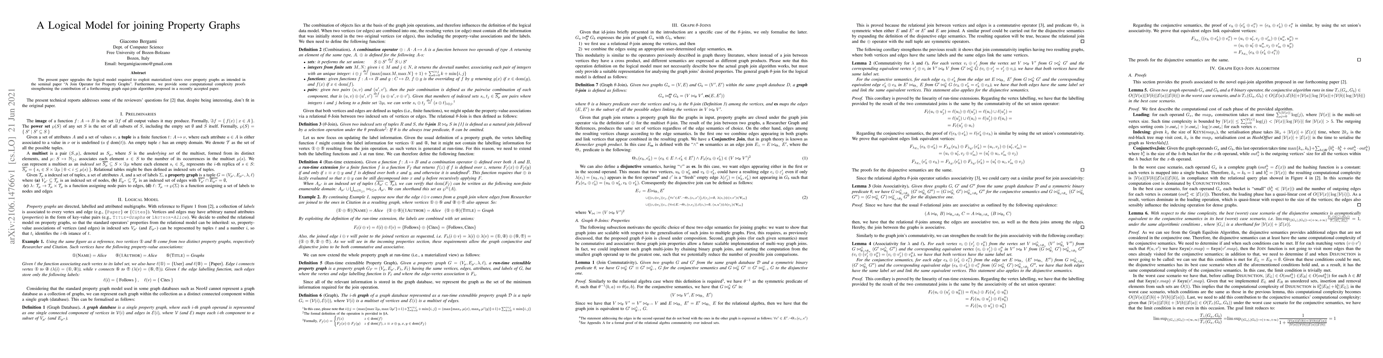 The present paper upgrades the logical model required to exploit materialized views over property graphs as intended in the seminal paper "A Join Operator for Property Graphs". Furthermore, we provide some computational complexity proofs strengthening the contribution of a forthcoming graph equi-join algorithm proposed in a recently accepted paper.
