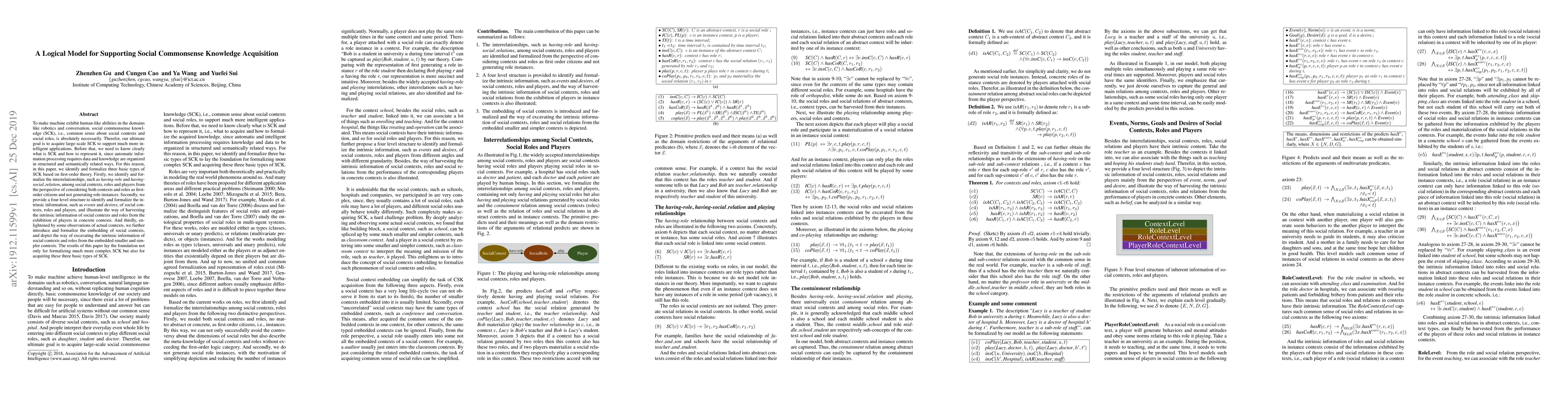 To make machine exhibit human-like abilities in the domains like robotics and conversation, social commonsense knowledge (SCK), i.e., common sense about social contexts and social roles, is absolutely necessarily. Therefor, our ultimate goal is to acquire large-scale SCK to support much more intelligent applications. Before that, we need to know clearly what is SCK and how to represent it, since automatic information processing requires data and knowledge are organized in structured and semantically related ways. For this reason, in this paper, we identify and formalize three basic types of SCK based on first-order theory. Firstly, we identify and formalize the interrelationships, such as having-role and having-social_relation, among social contexts, roles and players from the perspective of considering both contexts and roles as first-order citizens and not generating role instances. Secondly, we provide a four level structure to identify and formalize the intrinsic information, such as events and desires, of social contexts, roles and players, and illustrate the way of harvesting the intrinsic information of social contexts and roles from the exhibition of players in concrete contexts. And thirdly, enlightened by some observations of actual contexts, we further introduce and formalize the embedding of social contexts, and depict the way of excavating the intrinsic information of social contexts and roles from the embedded smaller and simpler contexts. The results of this paper lay the foundation not only for formalizing much more complex SCK but also for acquiring these three basic types of SCK.