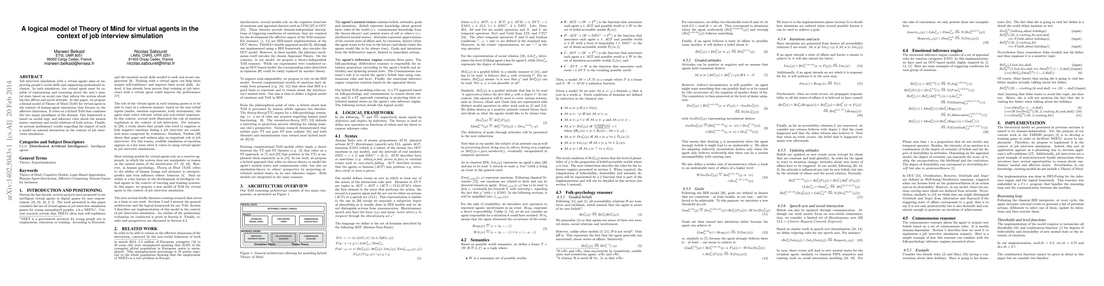 This paper proposes a formal logical model of Theory of Mind for virtual agents in job interview simulations, combining modal logic with inference rules to represent and reason about the user's mental states and emotions. Preliminary results indicate the model's potential to enhance natural interaction in simulated interviews.