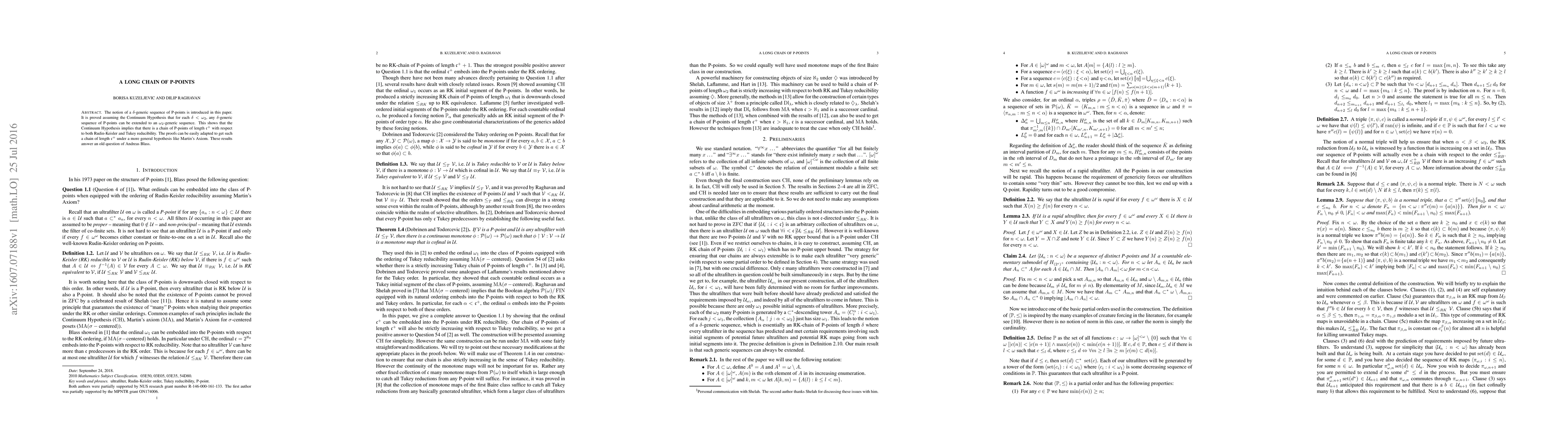 The notion of a $\delta$-generic sequence of P-points is introduced in this paper. It is proved assuming the Continuum Hypothesis that for each $\delta < {\omega}_{2}$, any $\delta$-generic sequence of P-points can be extended to an ${\omega}_{2}$-generic sequence. This shows that the Continuum Hypothesis implies that there is a chain of P-points of length ${\mathfrak{c}}^{+}$ with respect to both Rudin-Keisler and Tukey reducibility. The proofs can be easily adapted to get such a chain of length ${\mathfrak{c}}^{+}$ under a more general hypothesis like Martin's Axiom. These results answer an old question of Andreas Blass.