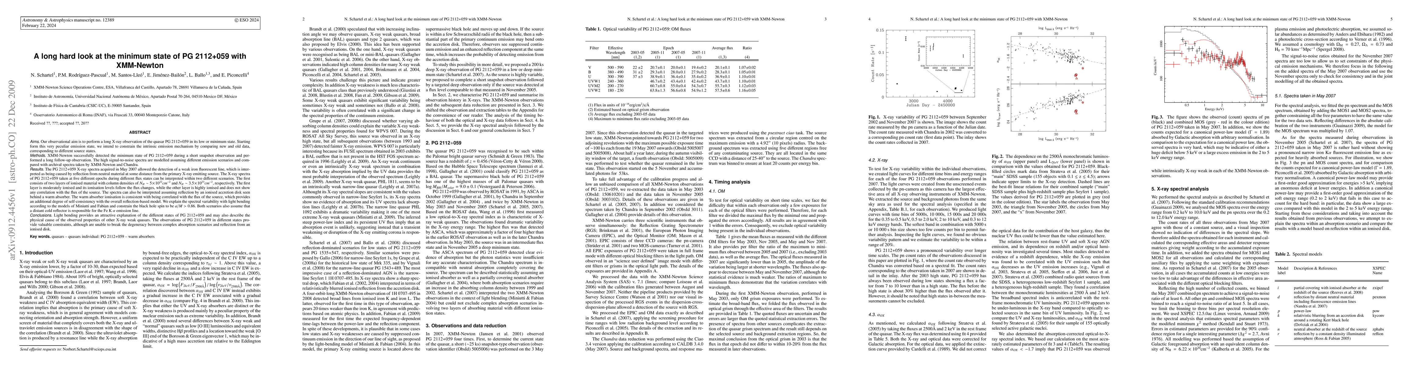 XMM-Newton successfully detected the minimum state of PG 2112+059 during a short snapshot observation and performed a long follow-up observation. The high signal-to-noise spectra are modelled assuming different emission scenarios and compared with archival spectra taken by XMM-Newton and Chandra. The PG 2112+059 X-ray spectra acquired in May 2007 allowed the detection of a weak iron fluorescent line, which is interpreted as being caused by reflection from neutral material at some distance from the primary X-ray emitting source. The X-ray spectra of PG 2112+059 taken at five different epochs during different flux states can be interpreted within two different scenarios. The first consists of two layers of ionised material with column densities of N_H ~5 x 10^22 cm^-2 and N_H ~3.5 x 10^23 cm^-2, respectively. The first layer is moderately ionised and its ionisation levels follow the flux changes, while the other layer is highly ionised and does not show any correlation with the flux of the source. The spectra can also be interpreted assuming reflection by an ionised accretion disk seen behind a warm absorber. The warm absorber ionisation is consistent with being correlated with the flux of the source, which provides an additional degree of self-consistency with the overall reflection-based model. We explain the spectral variability with light bending according to the models of Miniutti and Fabian and constrain the black hole spin to be a/M > 0.86. Both scenarios also assume that a distant cold reflector is responsible for the Fe K \alpha emission line. Light bending provides an attractive explanation of the different states of PG 2112+059 and may also describe the physical cause of the observed properties of other X-ray weak quasars.