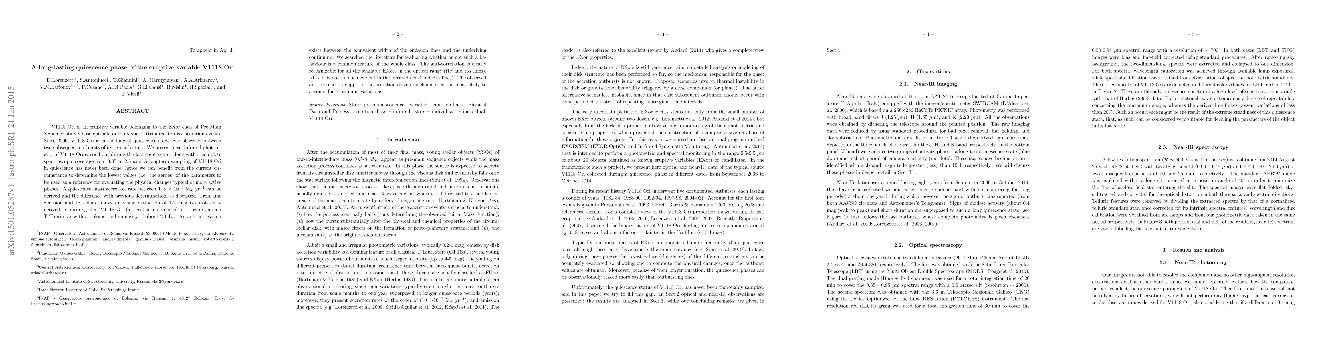 V1118 Ori, an eruptive variable star, has been observed in its longest quiescence phase since 2006. Near-infrared photometry and spectroscopic analysis reveal a quiescent mass accretion rate of 1-3 × 10^-9 M$_{sun}$ yr$^{-1}$ and a visual extinction of 1-2 mag. An anti-correlation between emission line equivalent width and underlying continuum supports an accretion-driven mechanism for continuum variations, observed in EXors but less evident in the infrared.