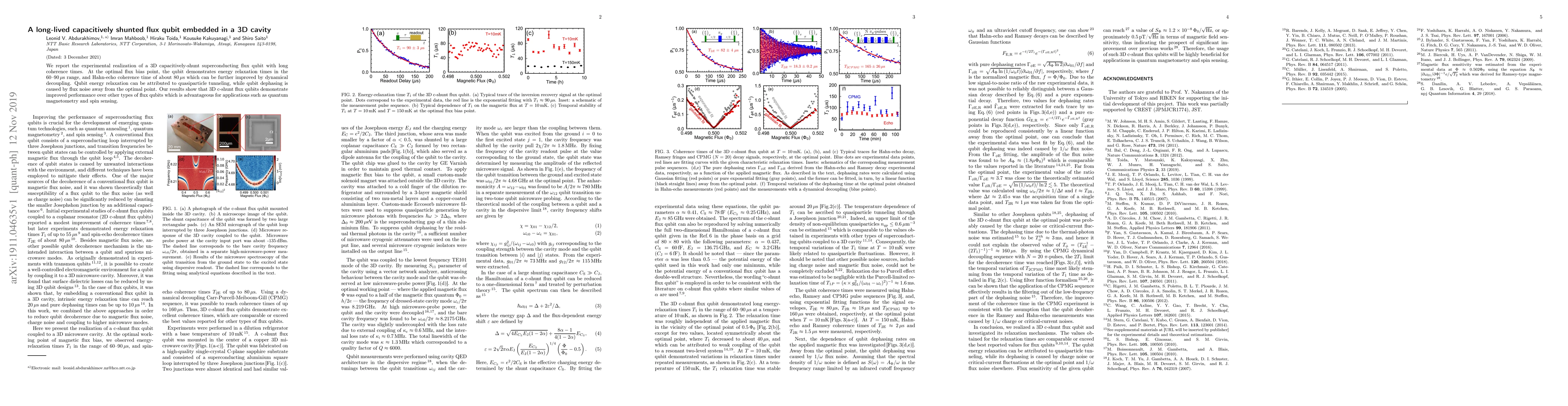 This paper reports the experimental realization of a 3D capacitively-shunted superconducting flux qubit with long coherence times, achieving energy relaxation times of 60-90 µs and a Hahn-echo coherence time of about 80 µs, which can be enhanced by dynamical decoupling. The improved performance over other flux qubits is beneficial for quantum magnetometry and spin sensing applications.