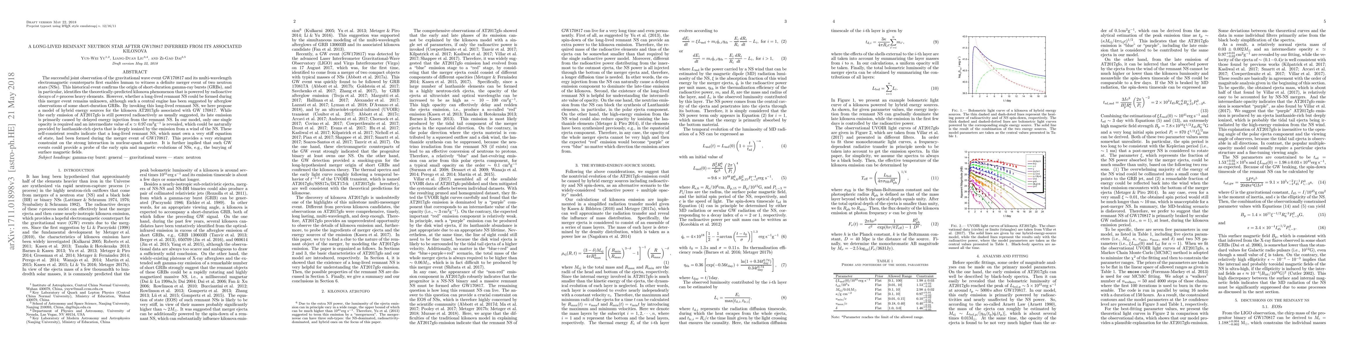 The successful joint observation of the gravitational wave event GW170817 and its multi-wavelength electromagnetic counterparts first enables human to witness a definite merger event of two neutron stars (NSs). This historical event confirms the origin of short-duration gamma-ray bursts (GRBs), and in particular, identifies the theoretically-predicted kilonova phenomenon that is powered by radioactive decays of $r$-process heavy elements. However, whether a long-lived remnant NS could be formed during this merger event remains unknown, although such a central engine has been suggested by afterglow observations of some short-duration GRBs. By invoking this long-lived remnant NS, we here propose a model of hybrid energy sources for the kilonova AT2017gfo associated with GW 170817. While the early emission of AT2017gfo is still powered radioactively as usually suggested, its late emission is primarily caused by delayed energy injection from the remnant NS. In our model, only one single opacity is required and an intermediate value of $\kappa\simeq0.97\,\rm cm^2g^{-1}$ is revealed, which could be naturally provided by lanthanide-rich ejecta that is deeply ionized by the emission from a wind of the NS. These self-consistent results indicate that a long-lived remnant NS, which must own a very stiff equation of state, had been formed during the merger event of GW170817. This provides a very stringent constraint on the strong interaction in nuclear-quark matter. It is further implied that such GW events could provide a probe of the early spin and magnetic evolutions of NSs, e.g., the burying of surface magnetic fields.
