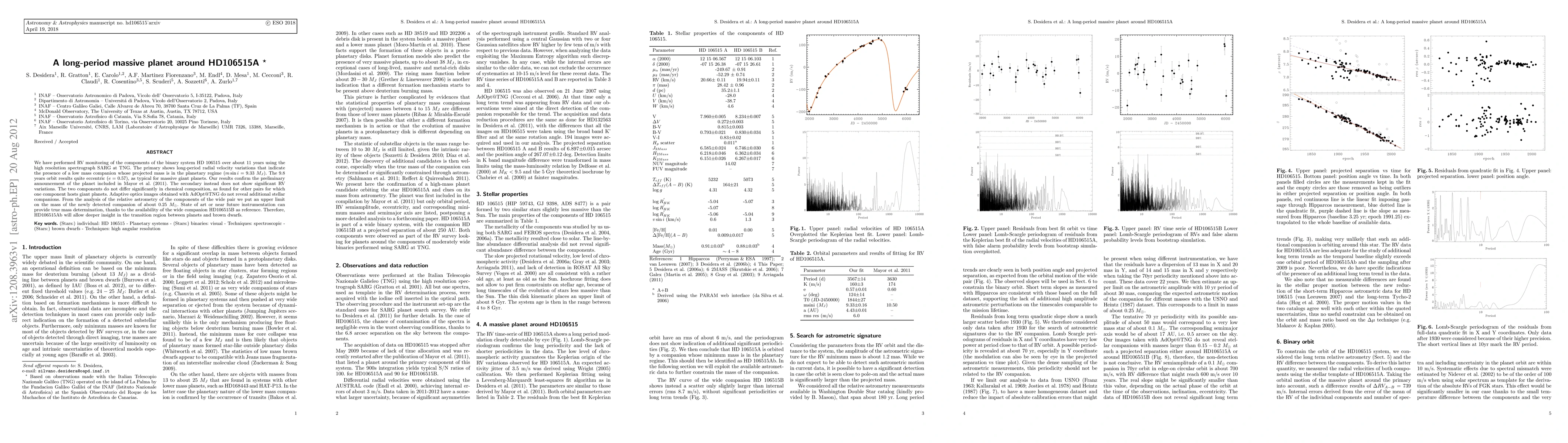 We have performed RV monitoring of the components of the binary system HD 106515 over about 11 years using the high resolution spectrograph SARG at TNG. The primary shows long-period radial velocity variations that indicate the presence of a low mass companion whose projected mass is in the planetary regime (m sin i = 9.33 Mjup). The 9.8 years orbit results quite eccentric (e=0.57), as typical for massive giant planets. Our results confirm the preliminary announcement of the planet included in Mayor et al. (2011). The secondary instead does not show significant RV variations. The two components do not differ significantly in chemical composition, as found for other pairs for which one component hosts giant planets. Adaptive optics images obtained with AdOpt@TNG do not reveal additional stellar companions. From the analysis of the relative astrometry of the components of the wide pair we put an upper limit on the mass of the newly detected companion of about 0.25 Msun. State of art or near future instrumentation can provide true mass determination, thanks to the availability of the wide companion HD106515B as reference. Therefore, HD106515Ab will allow deeper insight in the transition region between planets and brown dwarfs.