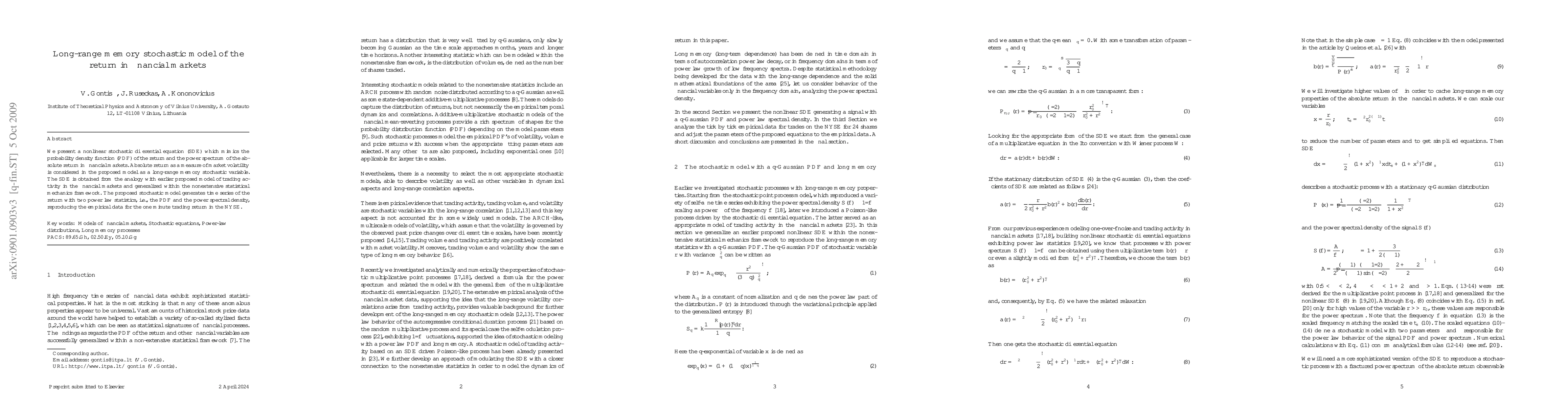 We present a nonlinear stochastic differential equation (SDE) which mimics the probability density function (PDF) of the return and the power spectrum of the absolute return in financial markets. Absolute return as a measure of market volatility is considered in the proposed model as a long-range memory stochastic variable. The SDE is obtained from the analogy with earlier proposed model of trading activity in the financial markets and generalized within the nonextensive statistical mechanics framework. The proposed stochastic model generates time series of the return with two power law statistics, i.e., the PDF and the power spectral density, reproducing the empirical data for the one minute trading return in the NYSE.