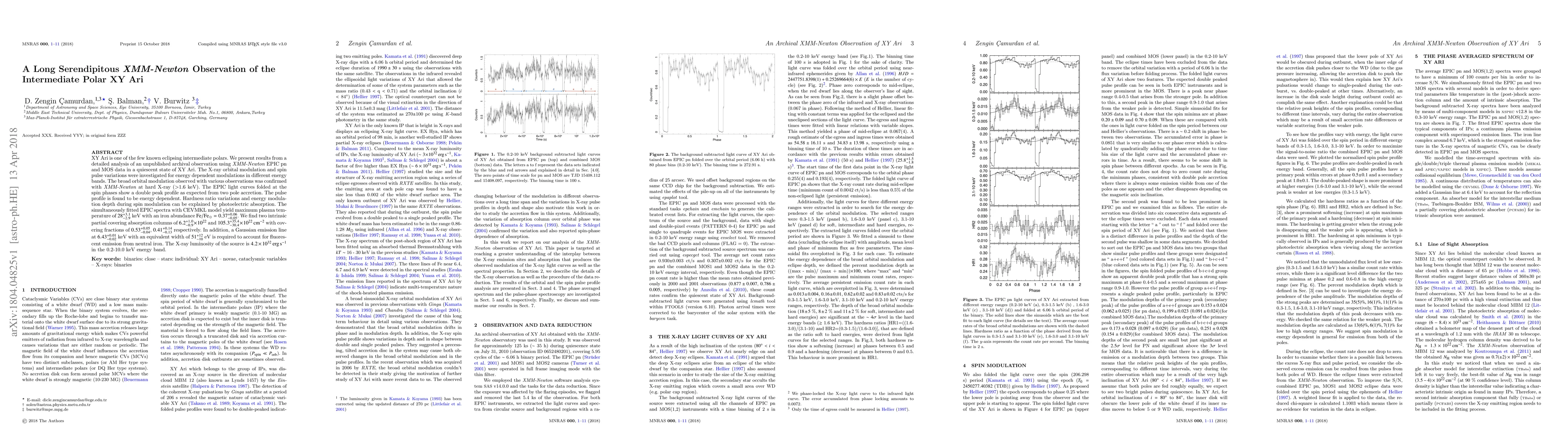 This study analyzes an XMM-Newton observation of the quiescent intermediate polar XY Ari, revealing energy-dependent X-ray orbital modulation and spin pulse variations. The analysis confirms broad orbital modulation in hard X-rays and identifies a double peak spin profile indicative of two pole accretion, with significant photoelectric absorption and partial covering absorption columns contributing to the observed spectral features.